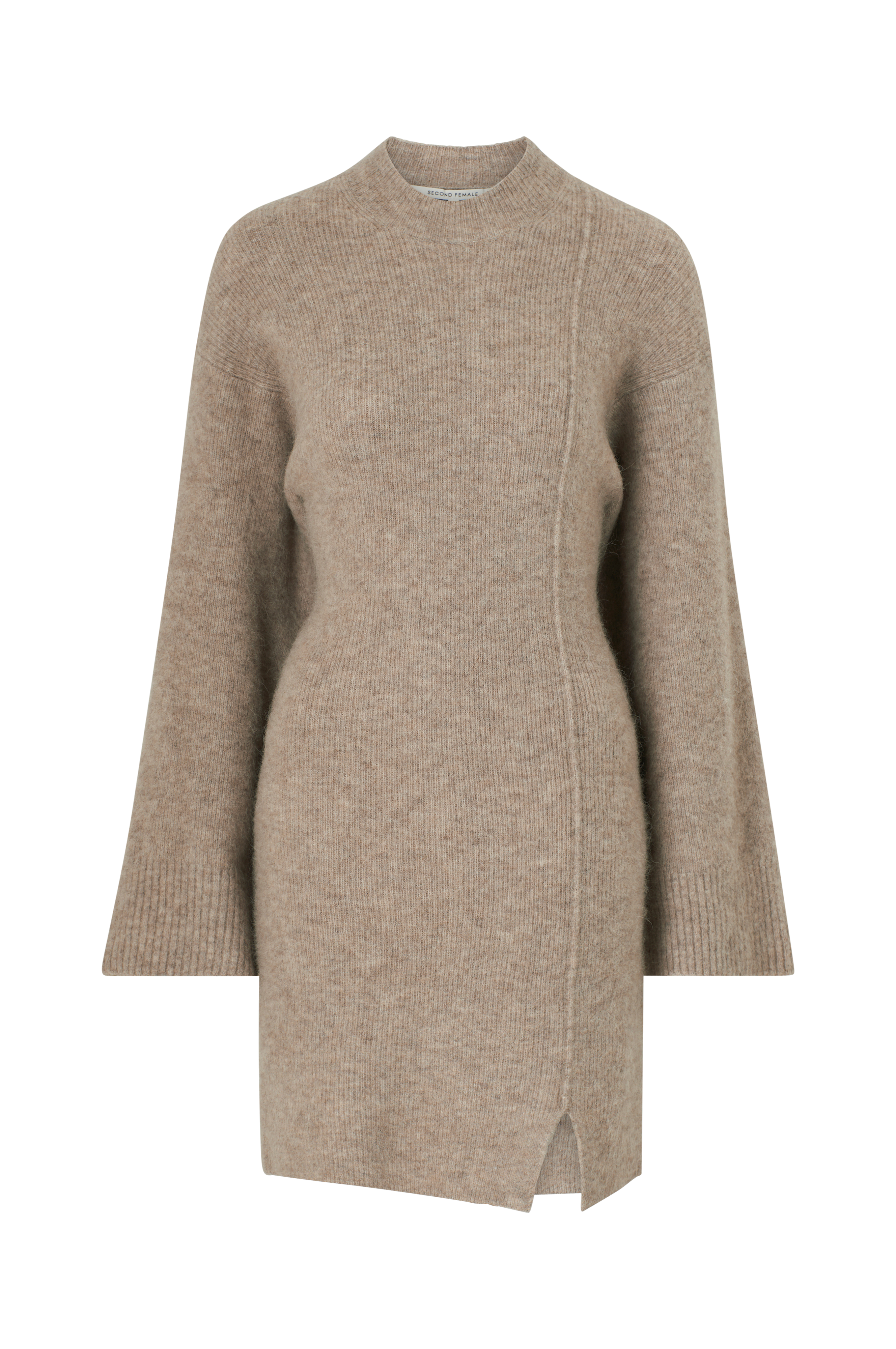 • Figurformad, stickad modell• Rund hals med ribbstickning• Nerhasad axel• Utsvängd, vid, extra lång ärm• Dekorativ söm fram med kort sprund nedtill• Bred ribbstickning i ärmsluten• Längd: 96 cm i storlek S