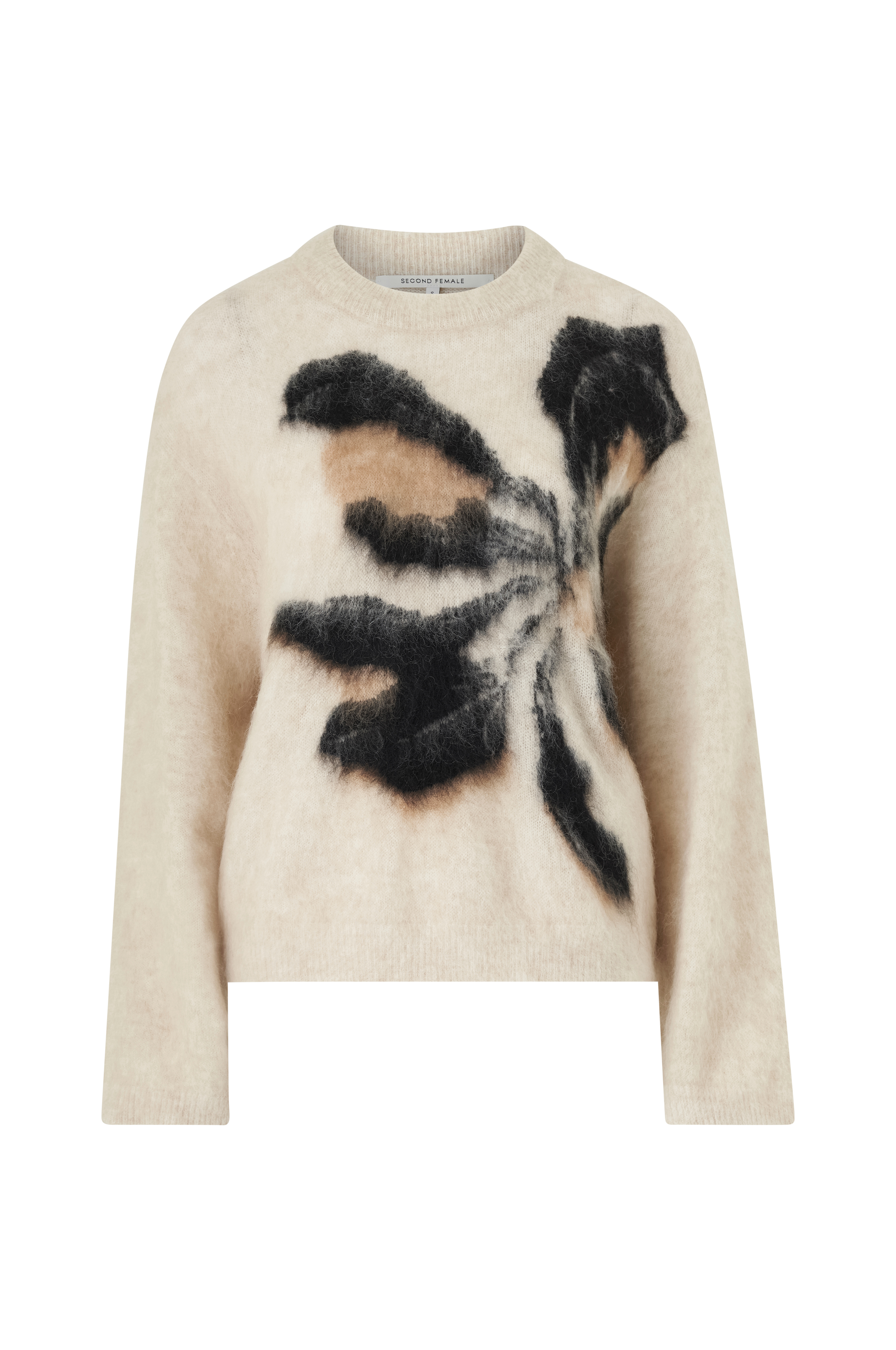 • Stickad tröja i mycket mjuk kvalitet med mohair och ull• Mjuk, hårig yta• Rund, ribbad halsringning• Dekorativt motiv fram• Ribbstickning i ärmsluten och nedtill