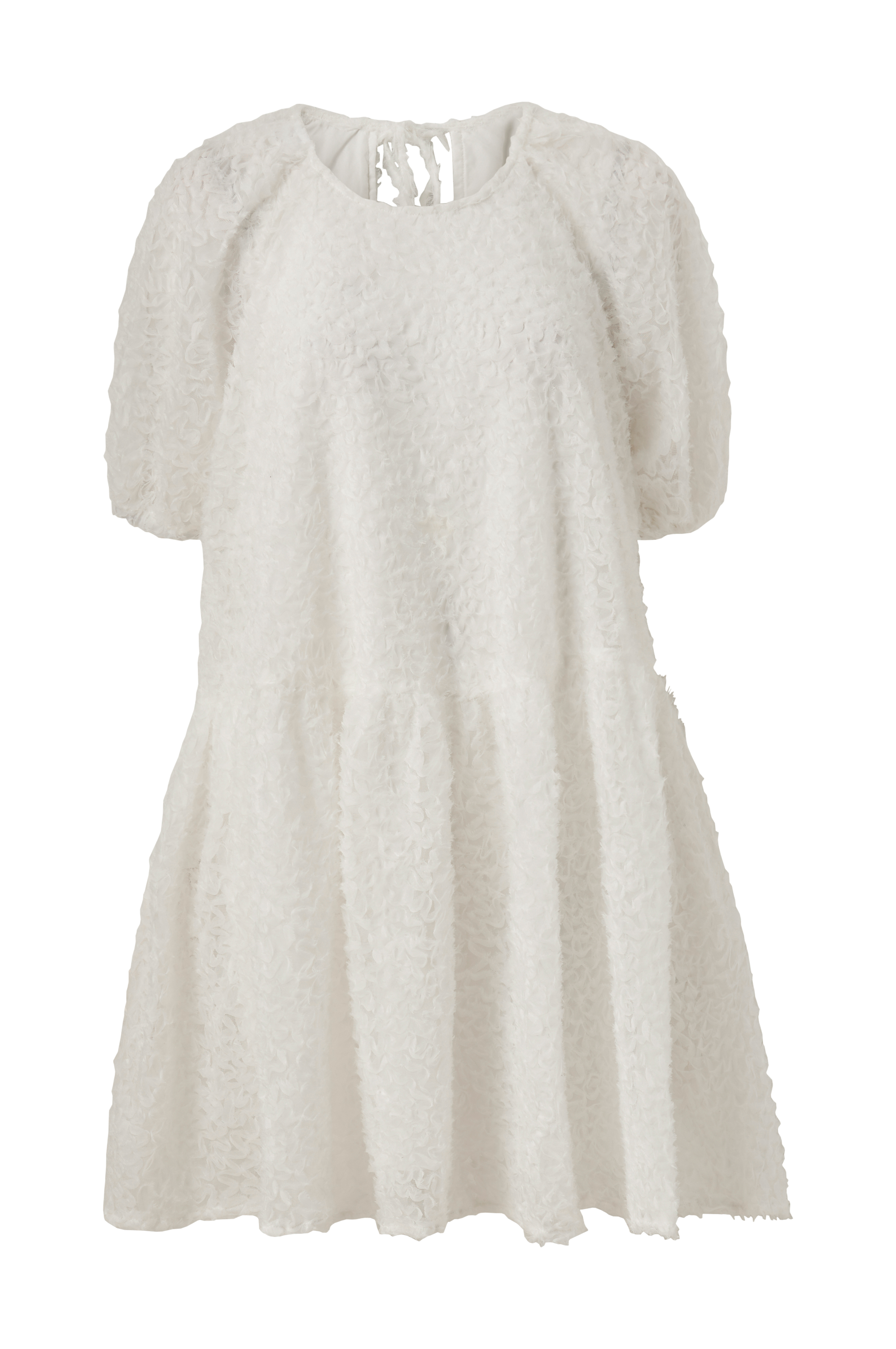 • Kort, utställd modell• Vid, lös passform• Korta puffärmar• Öppning med knytband i ryggen• Gjord av mesh med strukturerade applikationer• Fodrad• Längd: 90 cm i storlek 36