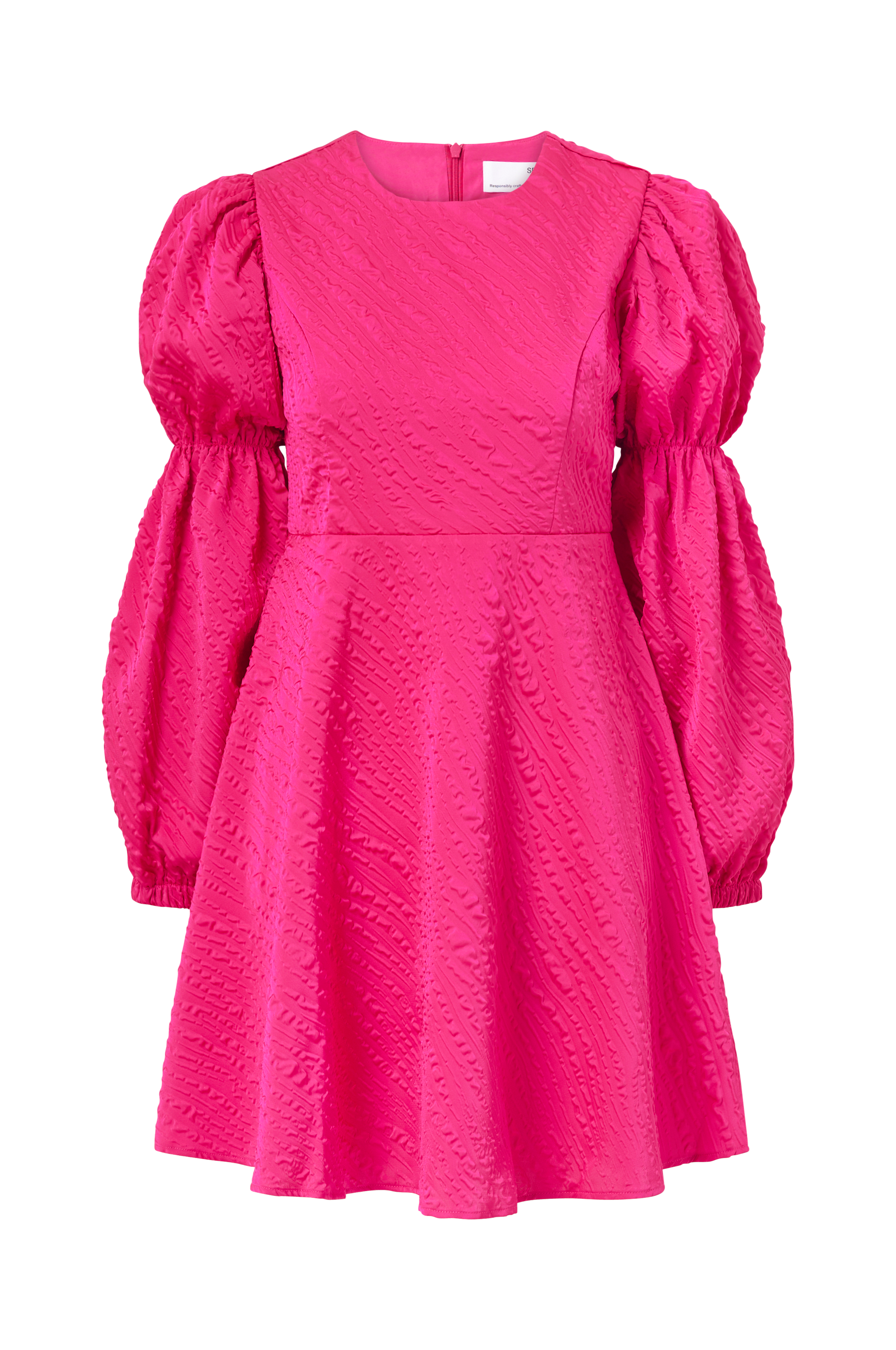 • Festklänning• Kort, utsvängd modell• Figurnära överdel• Dold dragkedja bak• Ballongärmar med resår upptill och i ärmsluten• Glansig kvalitet med strukturmönster• Längd: 88 cm i storlek 36