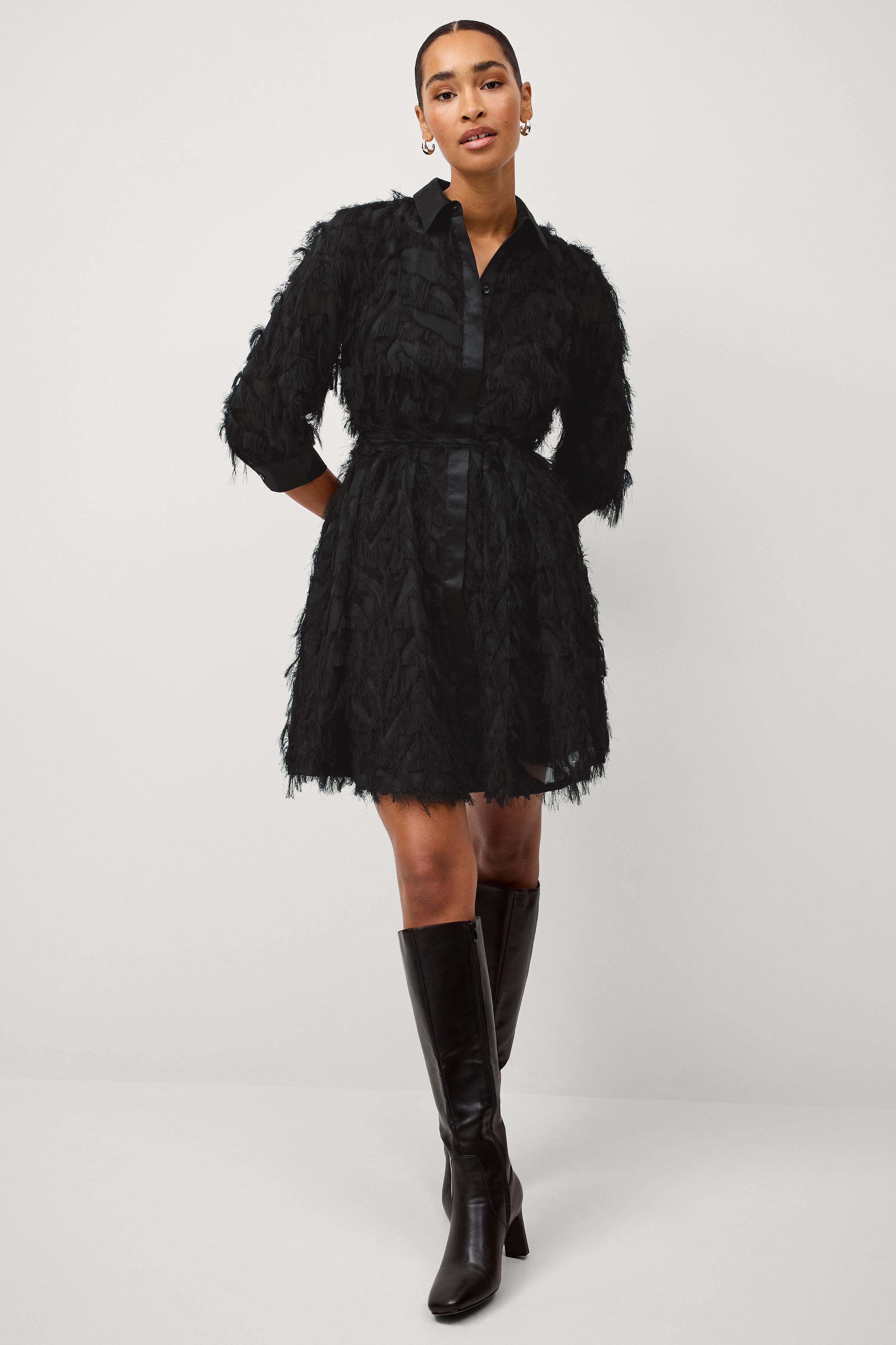 • Lätt utsvängd modell med tunna fransar över hela• Krage i satin• Knappslå med dolda knappar hela vägen fram• 3/4-lång ärm med manschett• Fodrad• Längd: 91 cm i storlek 36