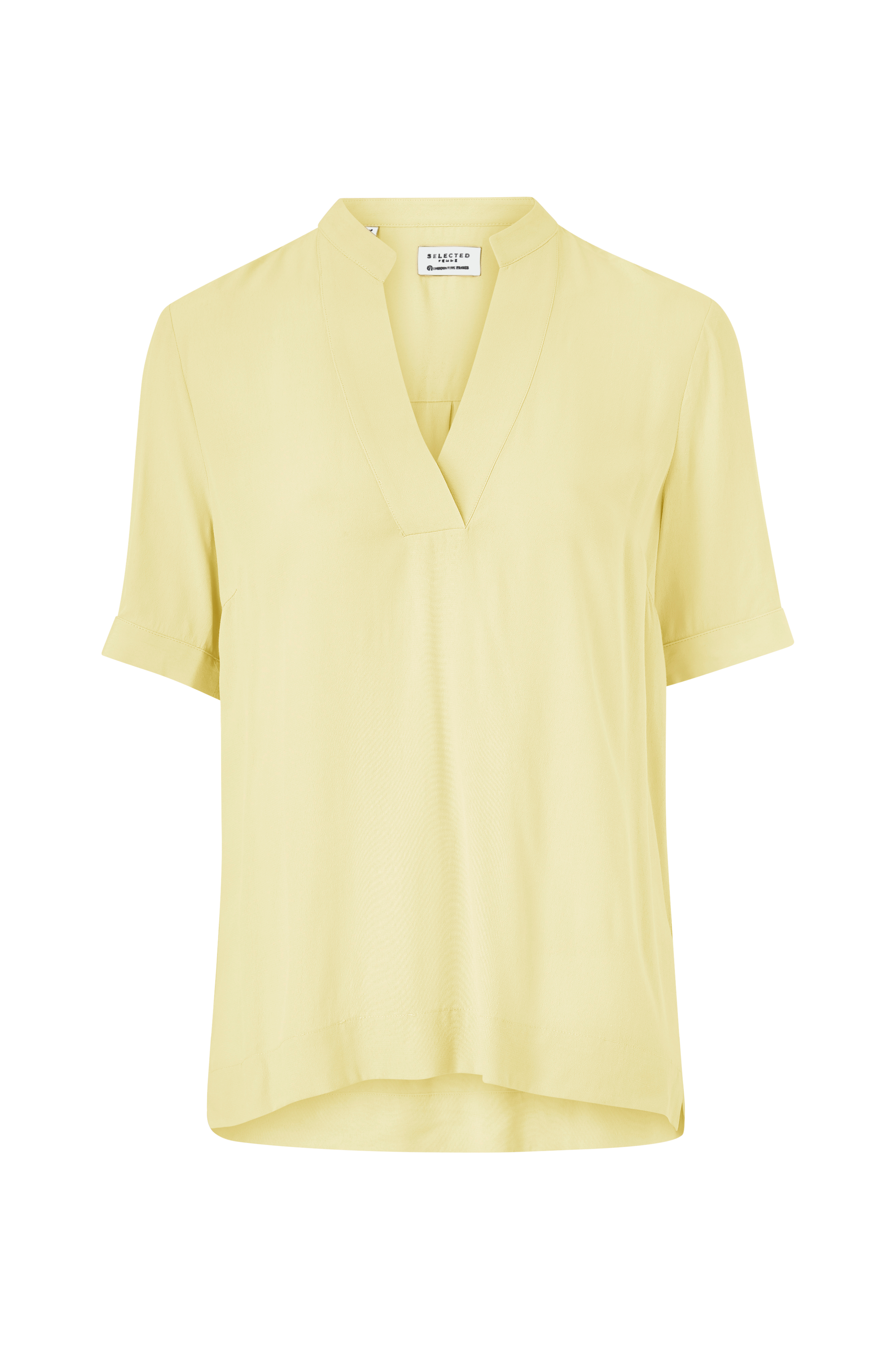 Topp slfElla SS Top från Selected Femme. Rak modell med ledig form och kort ärm med bred kant i ärmslut. V-ringning med bred kant och påsydd kant i halsen samt små sprund nertill i sidorna.