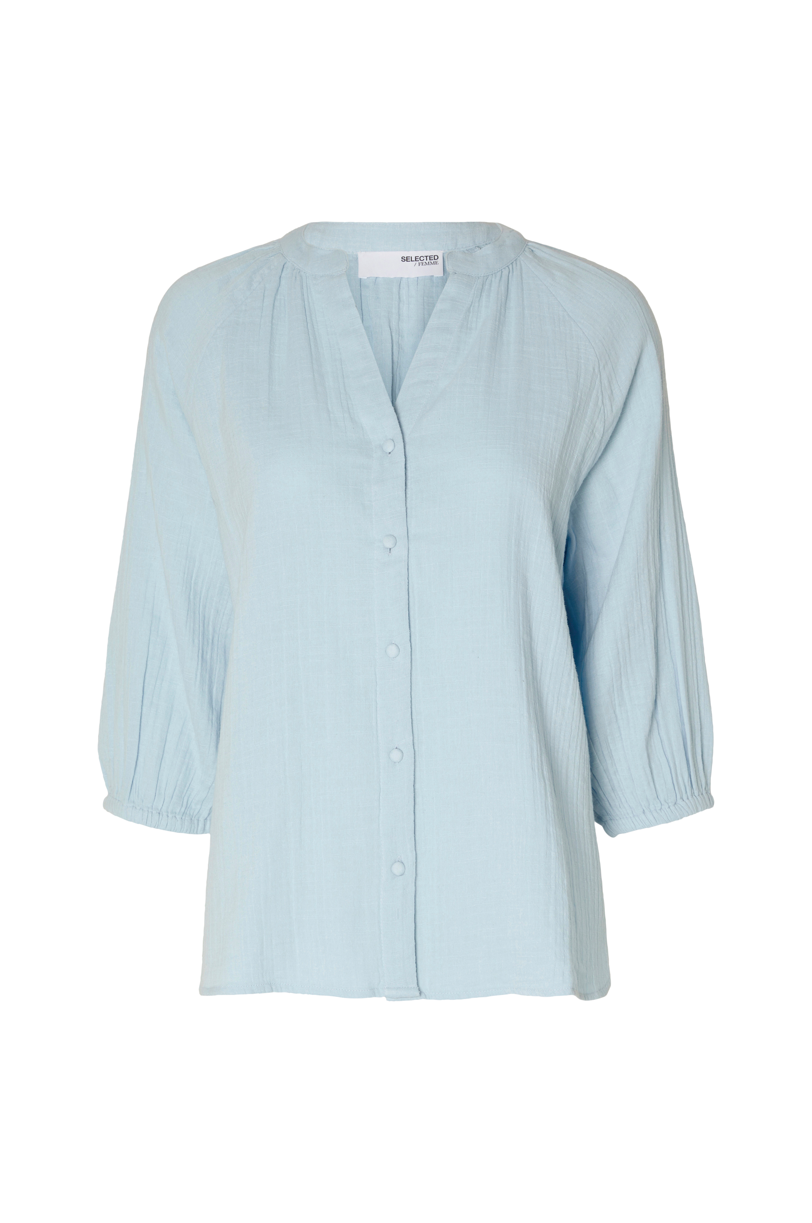 • V-ringning• Klädda knappar fram• 3/4-långa ärmar med elastiska ärmslut• Sprund nedtill i sidorna