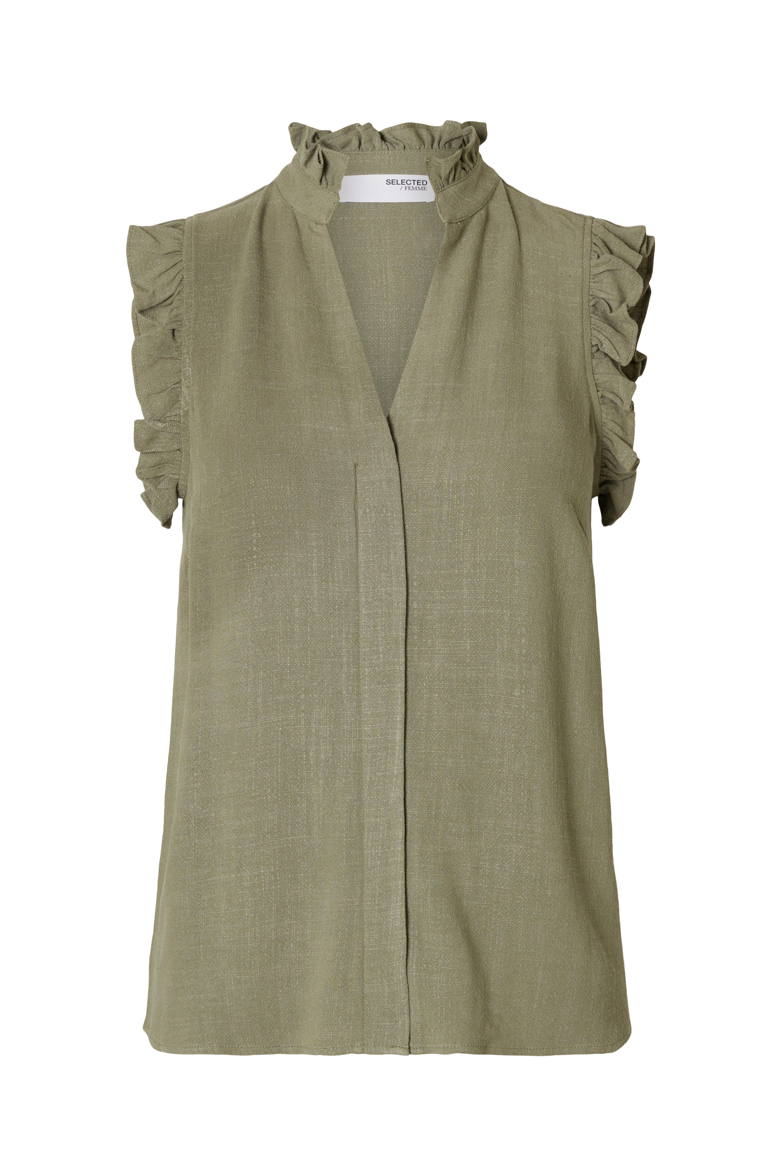 • Rak, ärmlös modell med liten volang runt ärmhålen