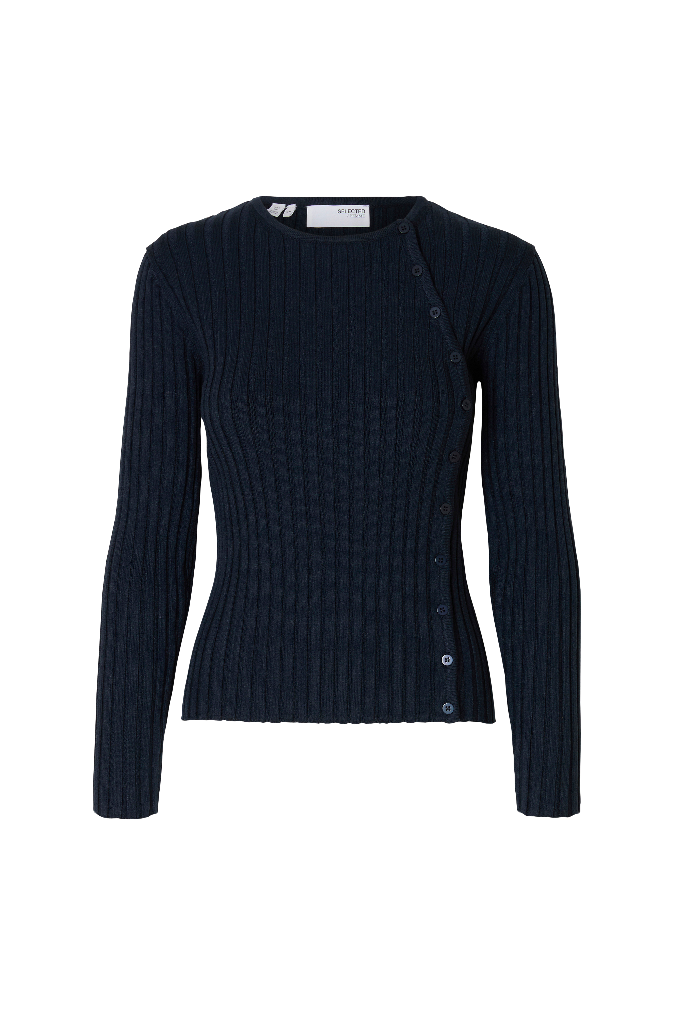 • Stretchig, ribbstickad cardigan• Knäppning fram vid sidan• Smal, ribbad halsringning