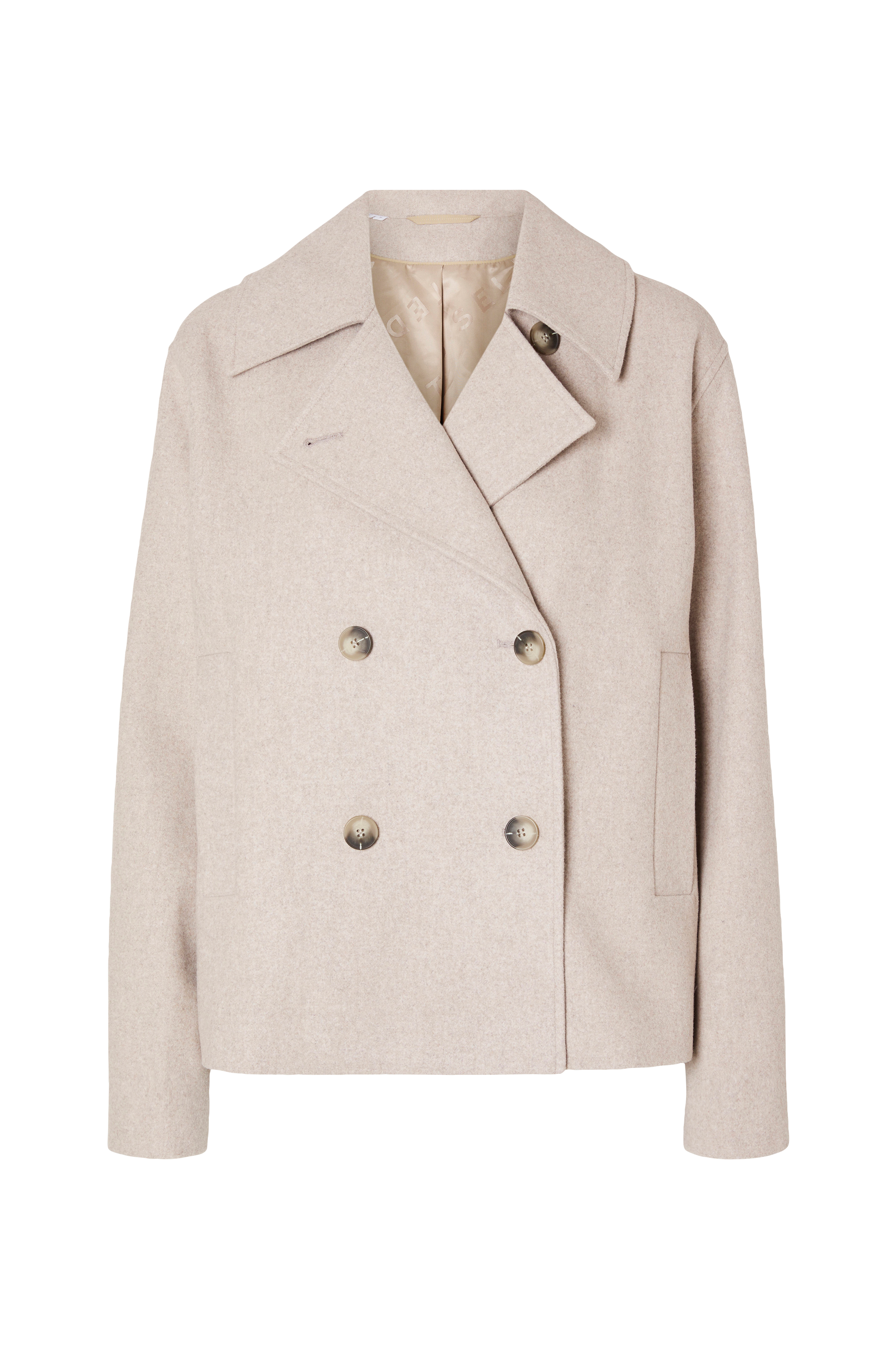 • Kort jacka i ullblandning• Dubbelknäppt modell• Sidfickor• Längd: 65 cm i storlek 36