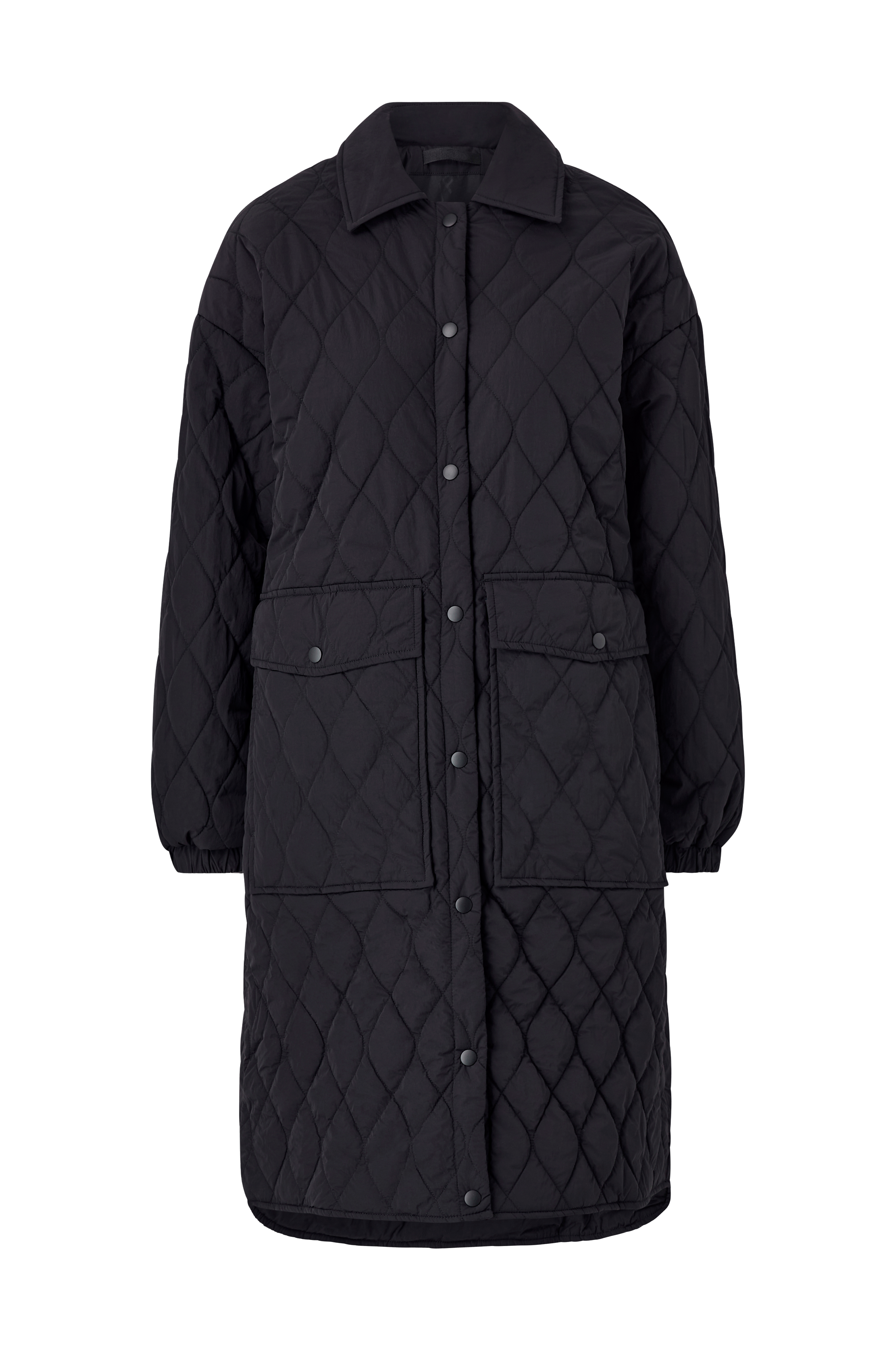 • Quiltad, lätt vadderad kappa• Stängning med tryckknappar• Resår i ärmsluten• Fyra fickor• En innerficka• Längd: 112 cm i storlek 36