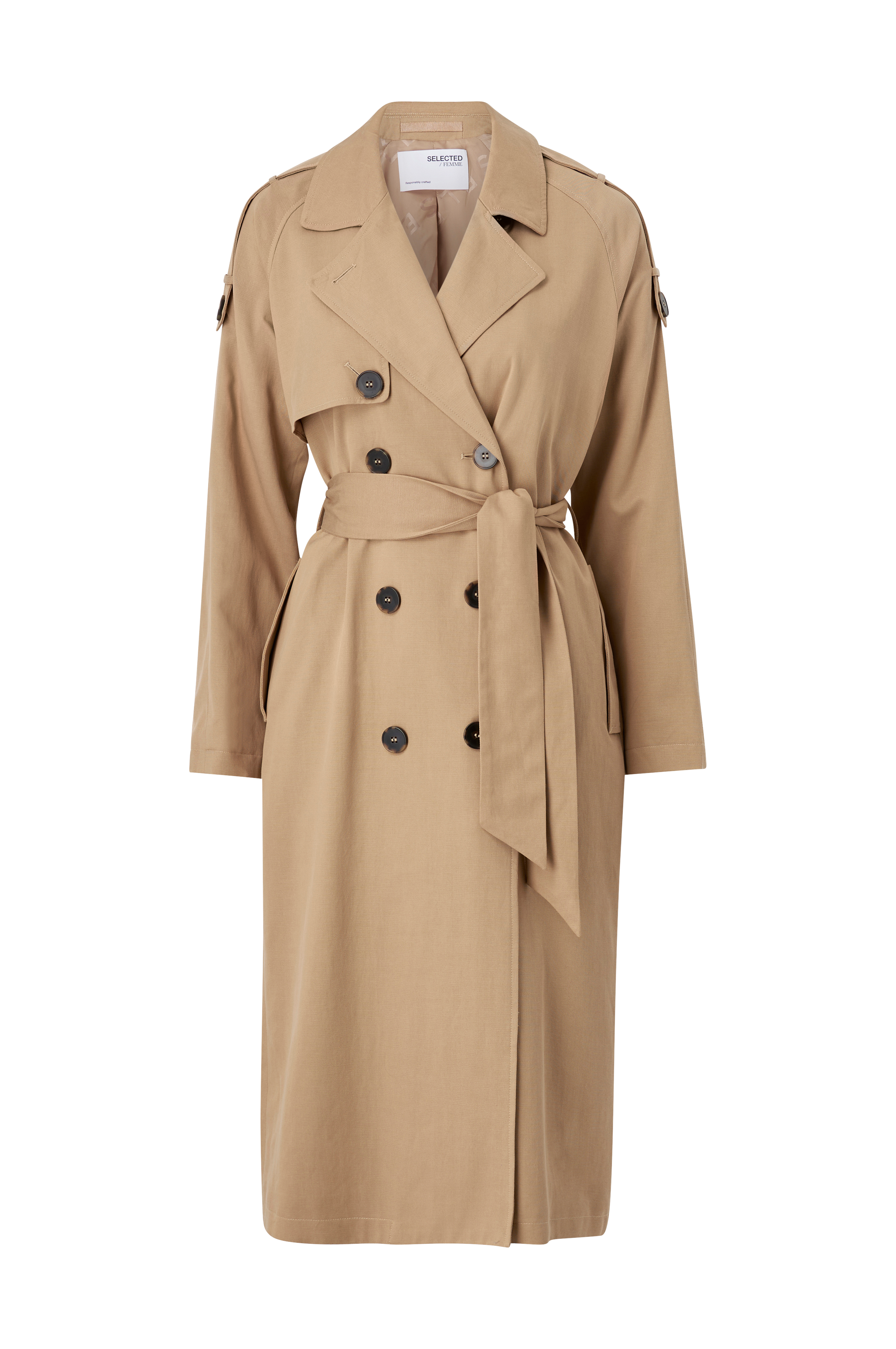 Trenchcoat i längre modell med knappdetaljer på axlarna och fram. Enkelknäppt med dubbla knapprader. Två fickor och knytskärp i midjan. En innerficka. Löst hängande ok bak med två knappar. Högt sprund nedtill bak. Längd ca 120 cm i stl 36.