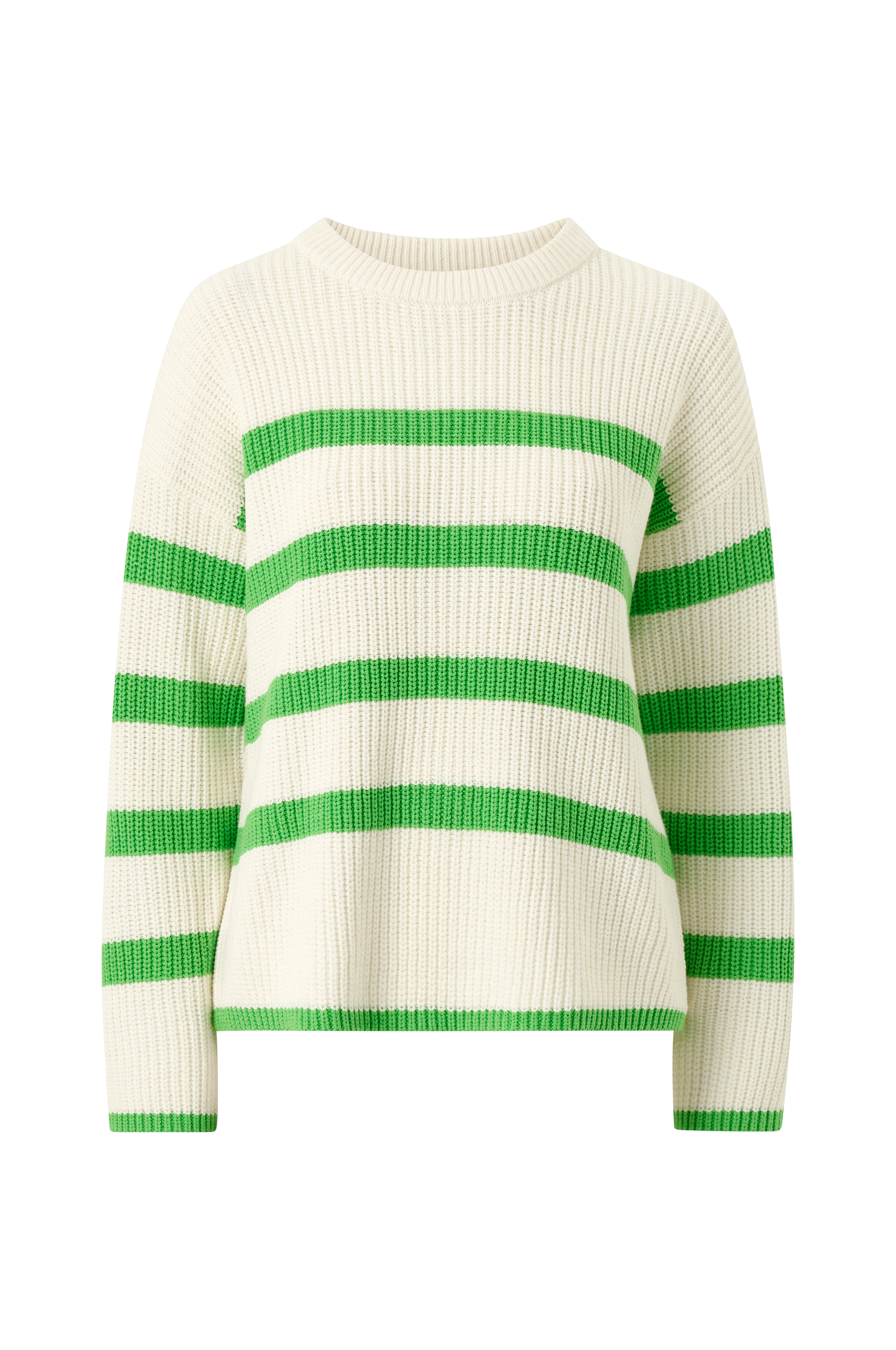 Grovstickad tröja i bomullsmix. Rund, ribbad halsringning. Nedhasade axlar.