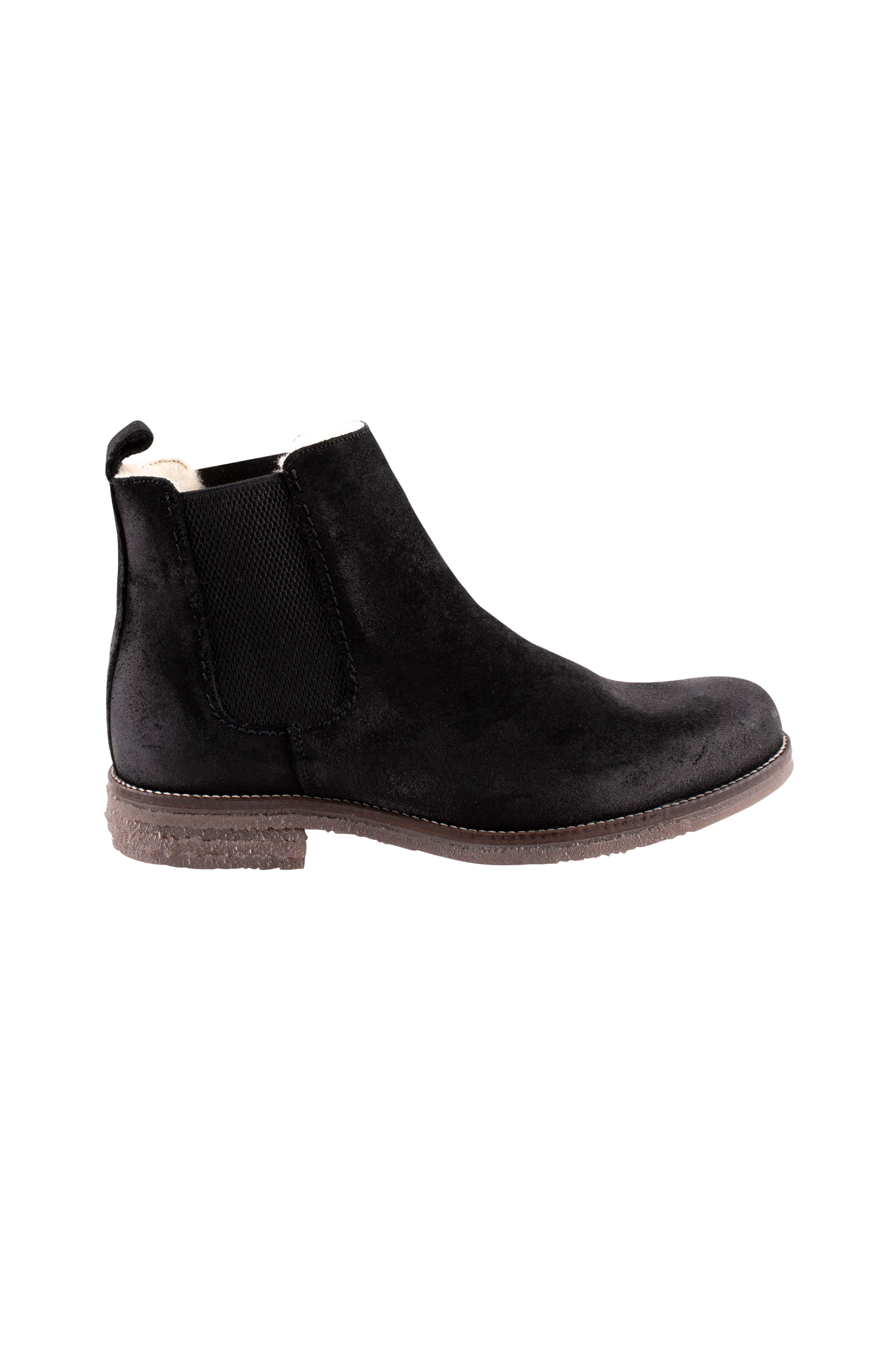 Shepherd emanuel är ett par chelseaboots i mocka med varmt och skönt fårskinn på insidan. Stövlarna har bred resår på sidorna av skaftet och en tagg baktill. Yttersulan är tillverkad av gummi och har dekorativa sömmar.