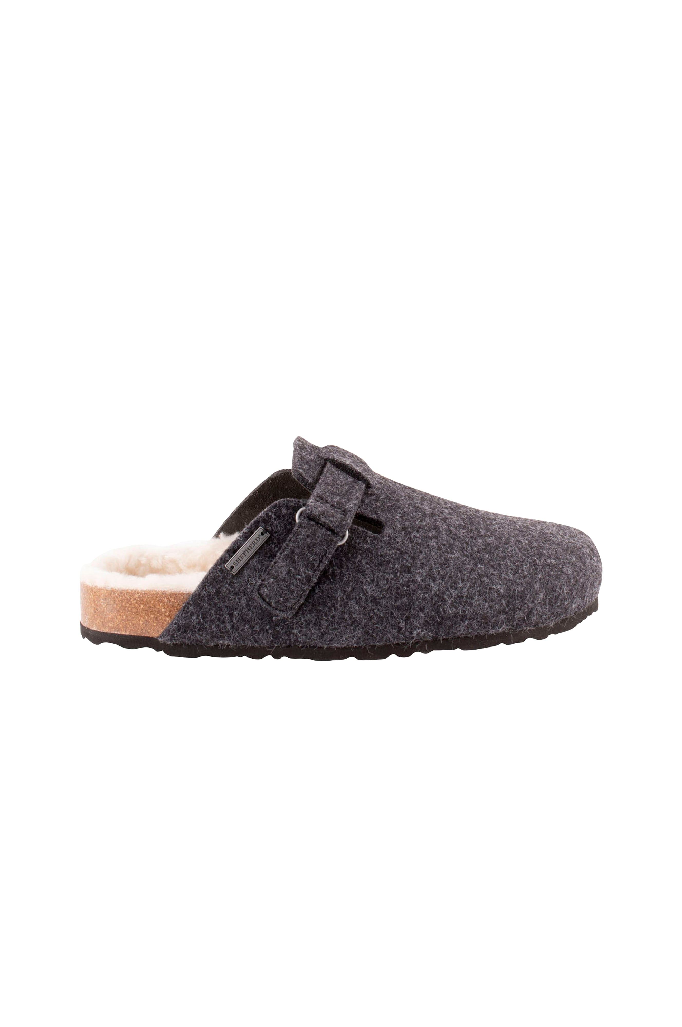 Shepherd Valdemar. Ett par sandaler i mjuk ull. Sandalerna har breda remmar med kardborreknäppning. Den fotformade korksulan är täckt av fårskinn. Eva yttersula för en lätt och dämpad sandal.