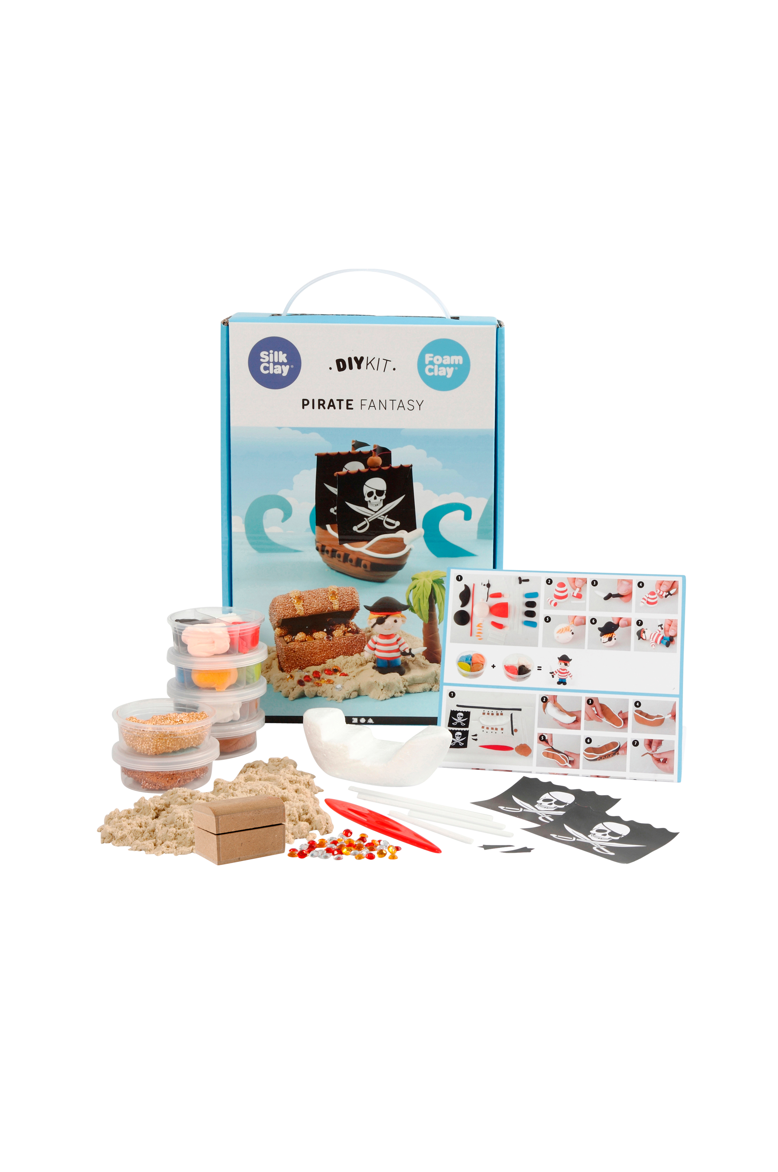 - Innehåller: Foam Clay och Silk Clay i flera färger till sjörövarskepp, palmer och pirater. Därutöver skattkista av trä, rhinestones till en 'hemlig skatt' och Sandy Art till en öde ö