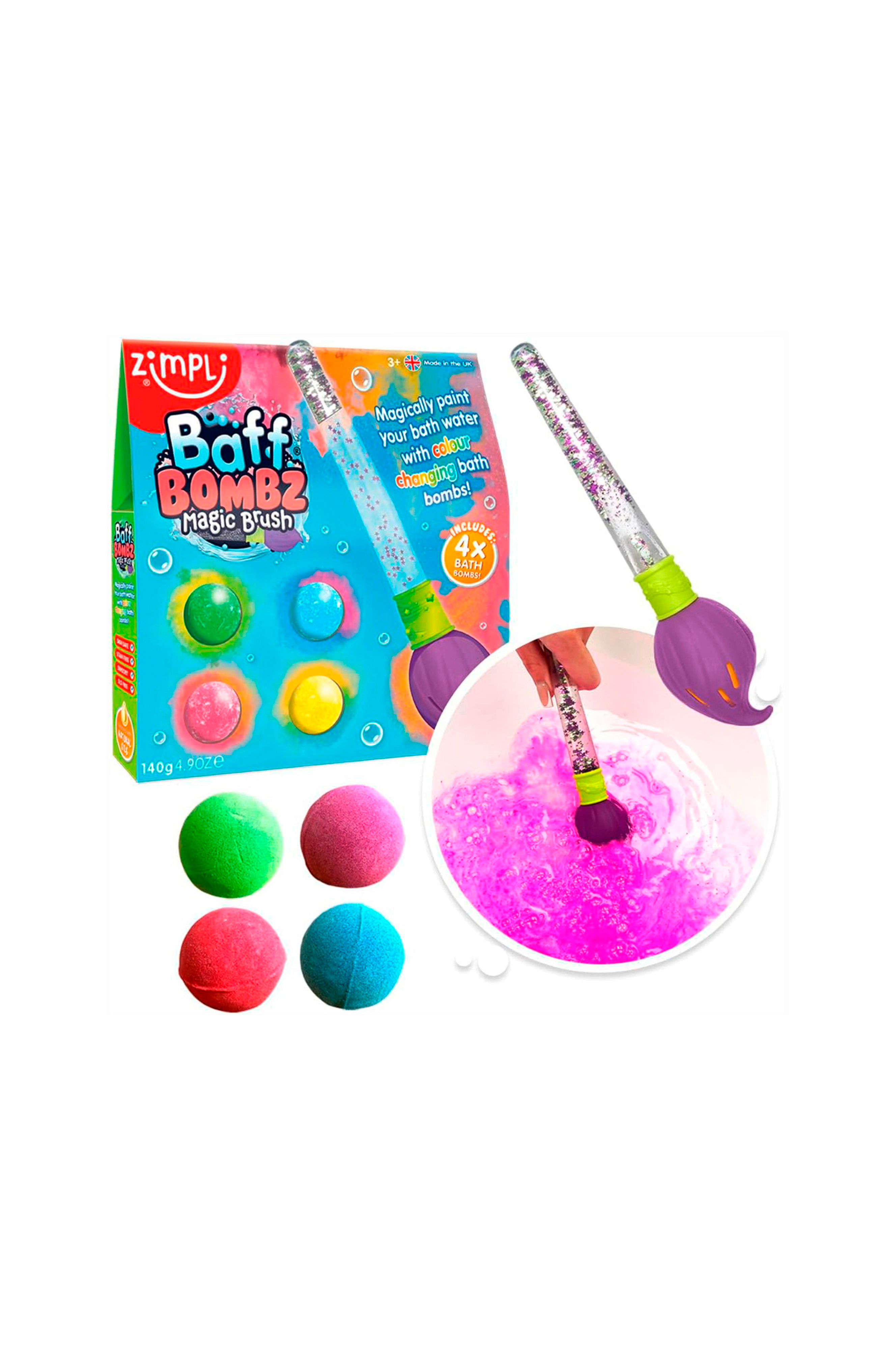 Innehåller 4 x 35 g Baff Bombz och en magisk Baff Bomb pensel. Penseln kan sedan fyllas på med vanliga badbomber (max. 4 cm i diameter).