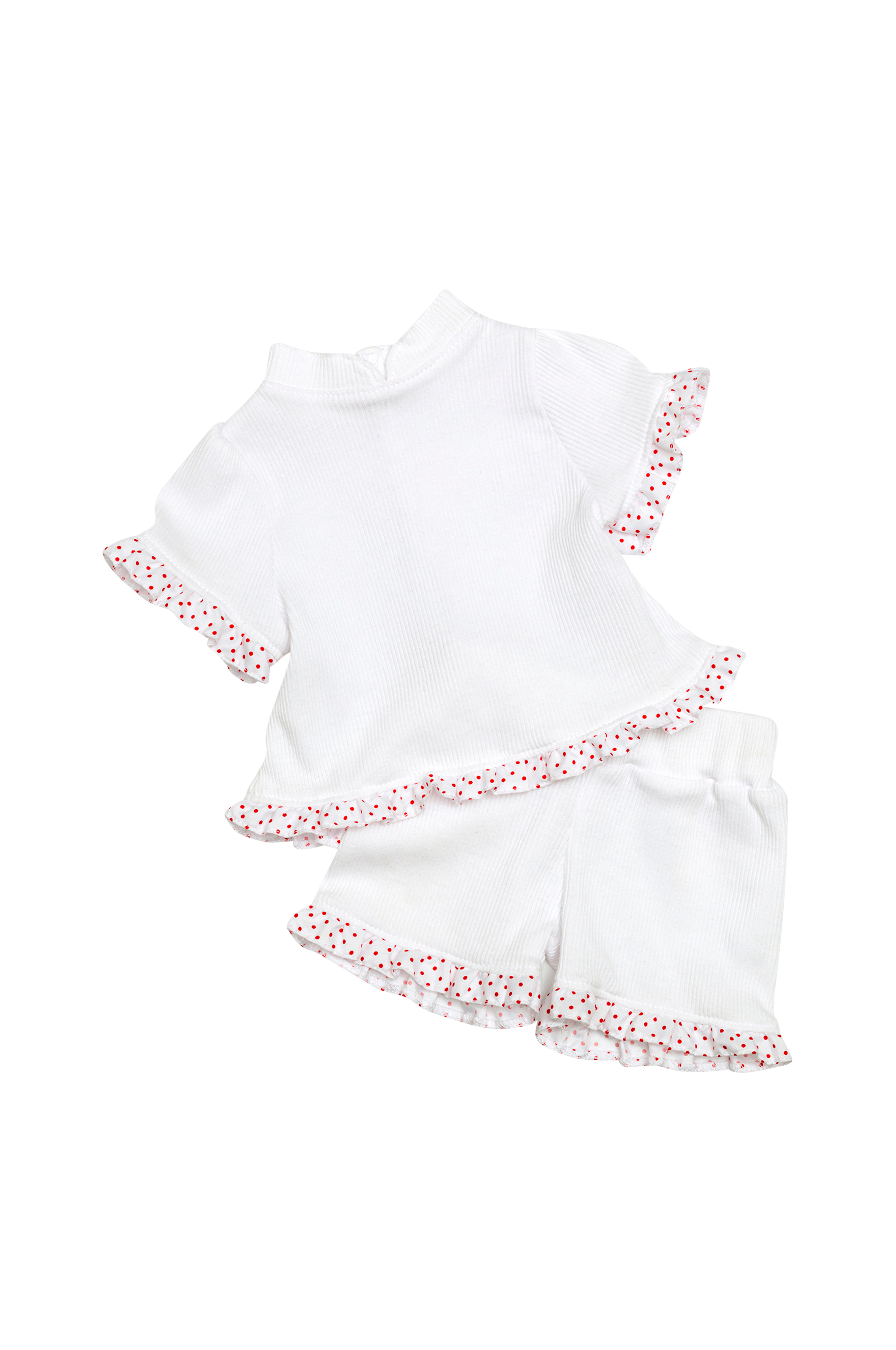 Pyjamasen är vit och har söta rödprickiga volanger. Den är tvådelad och har korta ärmar och ben, mycket mysigt tycker Skrållan. Matcha gärna med Skrållans egen morgonrock så blir dockan extra fin vid frukostbordet. Det finns också många fler dockkläder av hög kvalitet till taldockan Skrållan, så hon kan vara rätt klädd för lek både ute och inne.