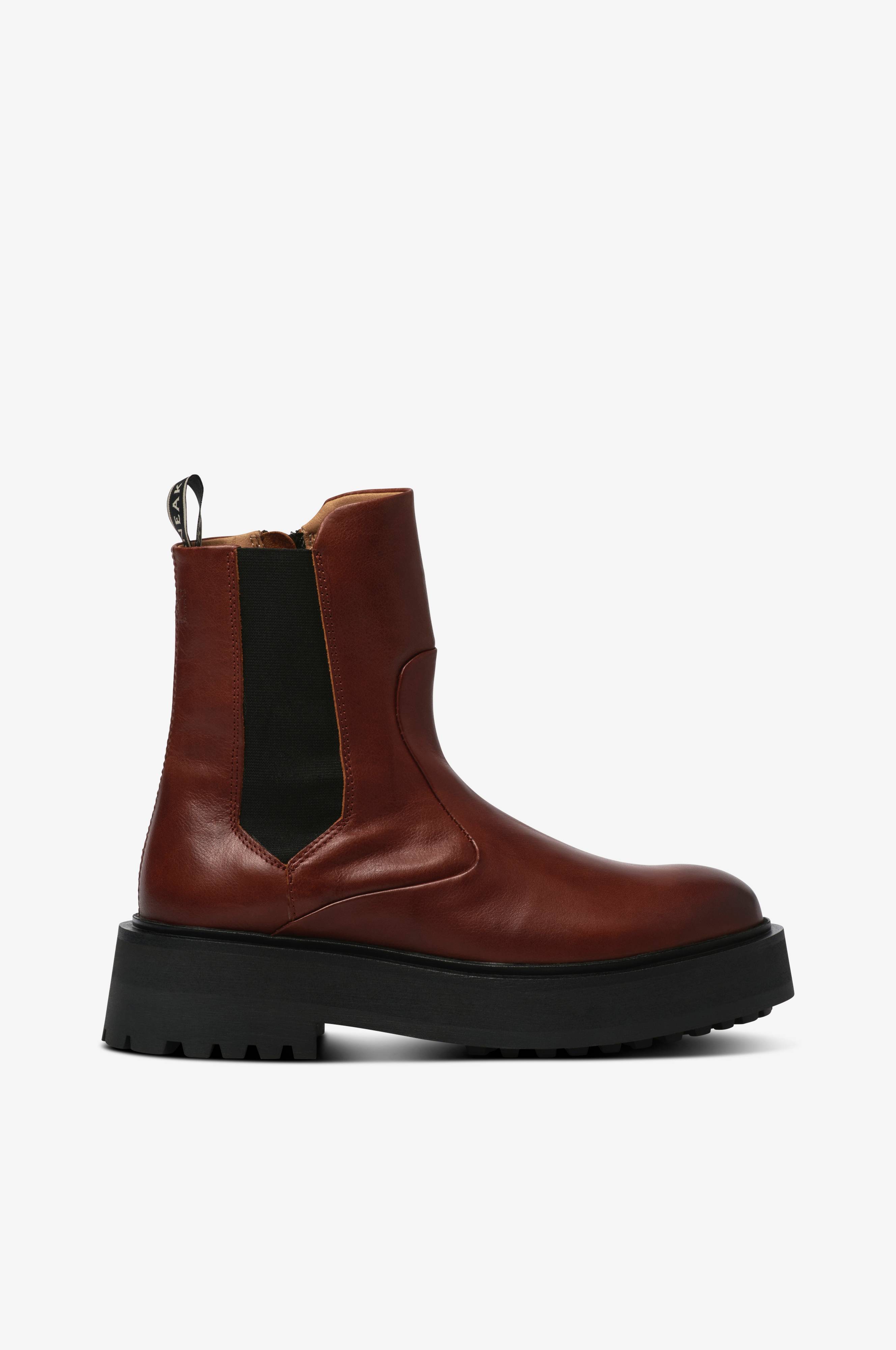 Boots i skinn med hög, grov sula. Infälld resår på utsida skaftet och dragkedja med lång tamp på insidan samt hank baktill.