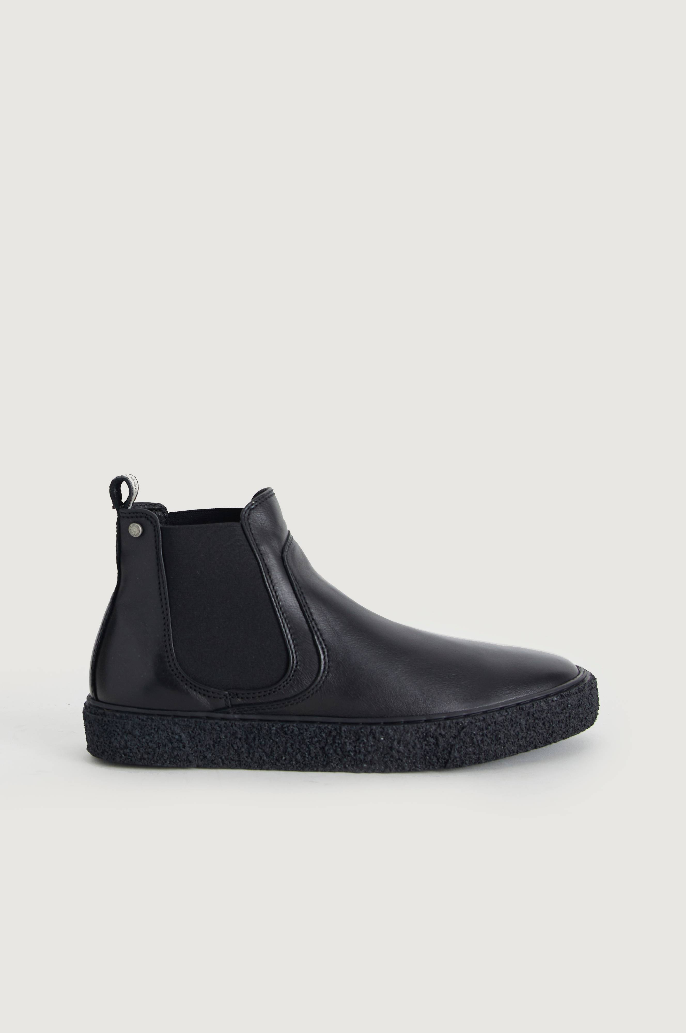 Boots i skinn med varmt foder i teddy. Bred resårinfällning på båda sidor om skaftet och tamp baktill. Grov yttersula med bred kant runt om.
