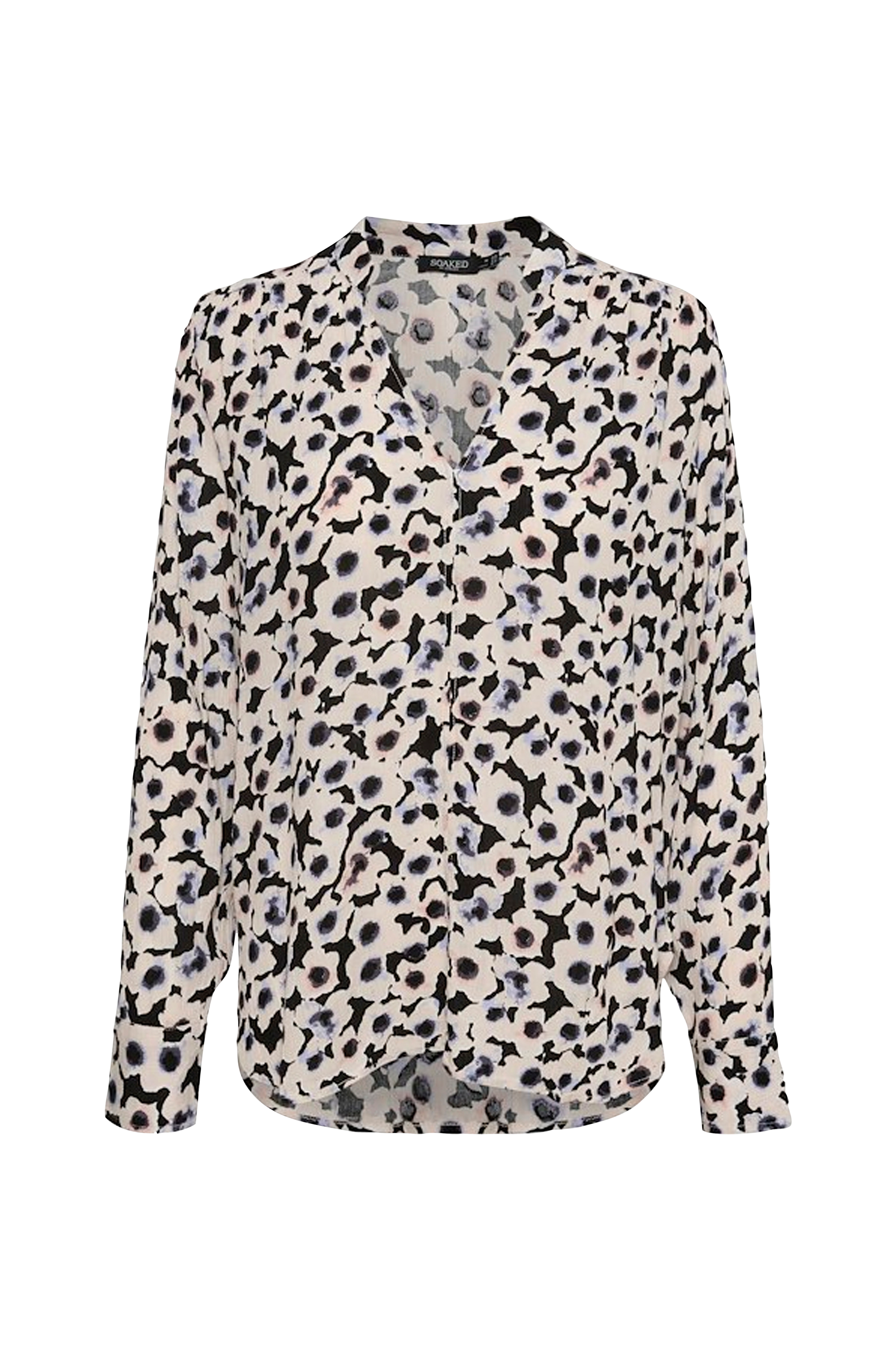 Blus i tunn, vävd kvalitet. V-ringning fram och långa ärmar med manschett och knapp. Rynkad axelsöm framtill. Rundade sidor med sprund nedtill.
