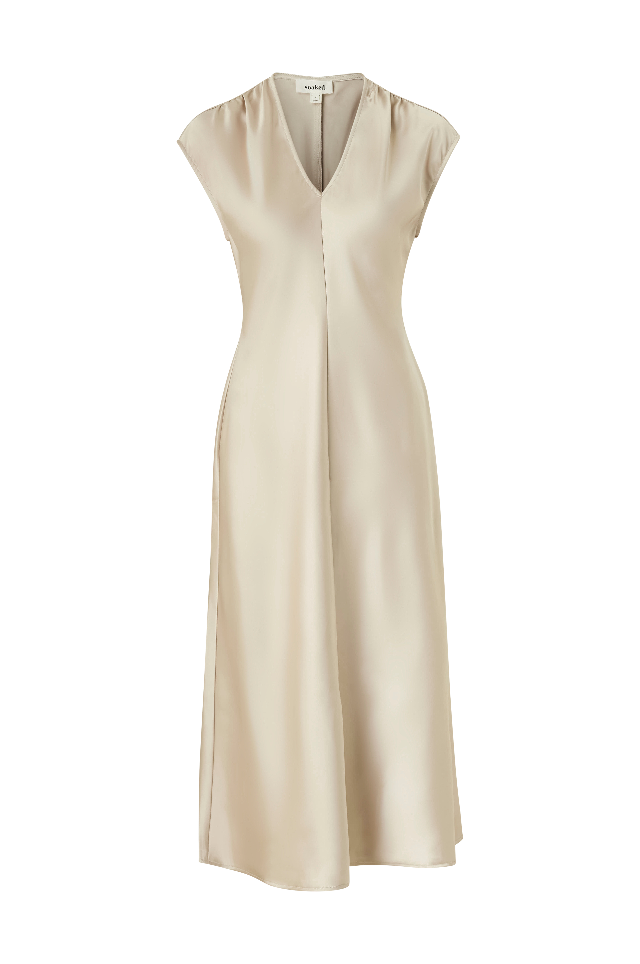 • Figurformad, ärmlös modell i satin• V-ringad hals• Rynk på axlarna• Längd: 128 cm i storlek S