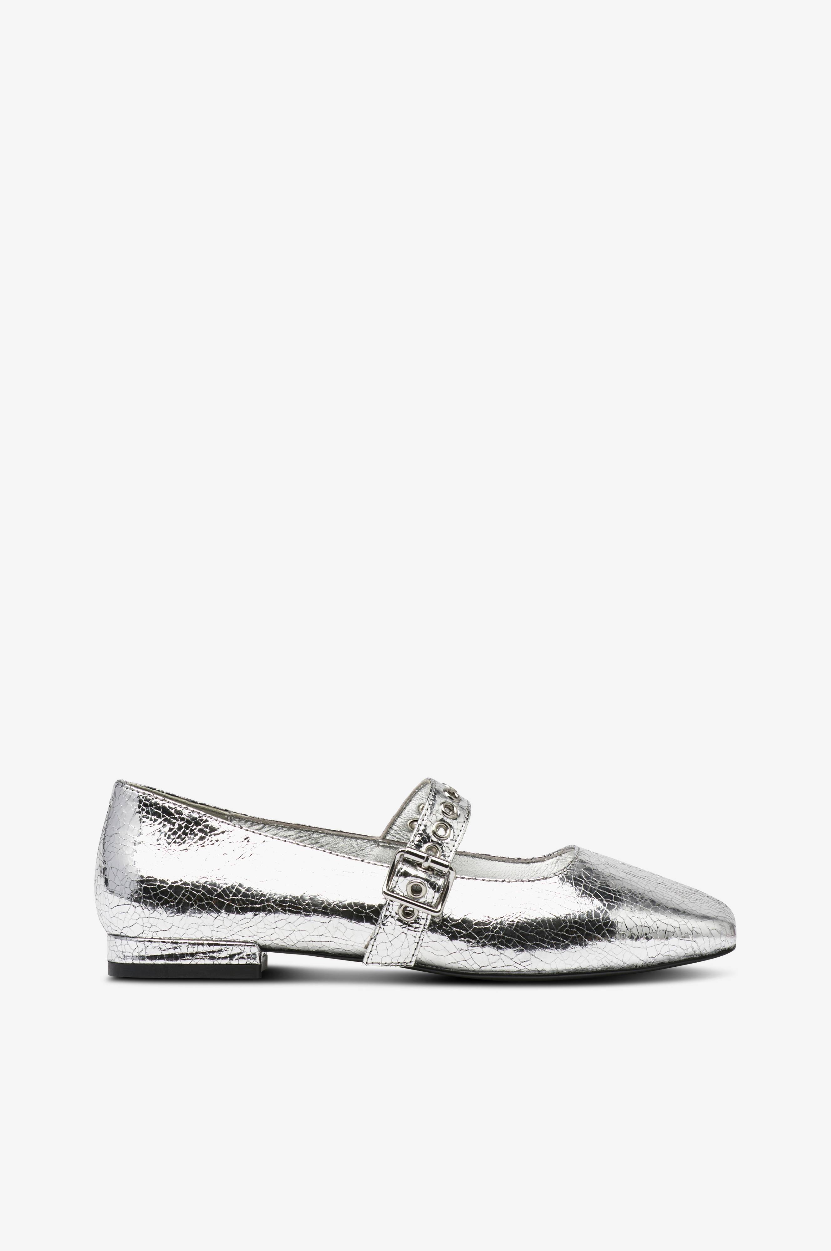 • Silverfärgad modell i skinn• Rak tå• Justerbar rem över vristen med öljetter• Skinnfodrad• Sula i gummi