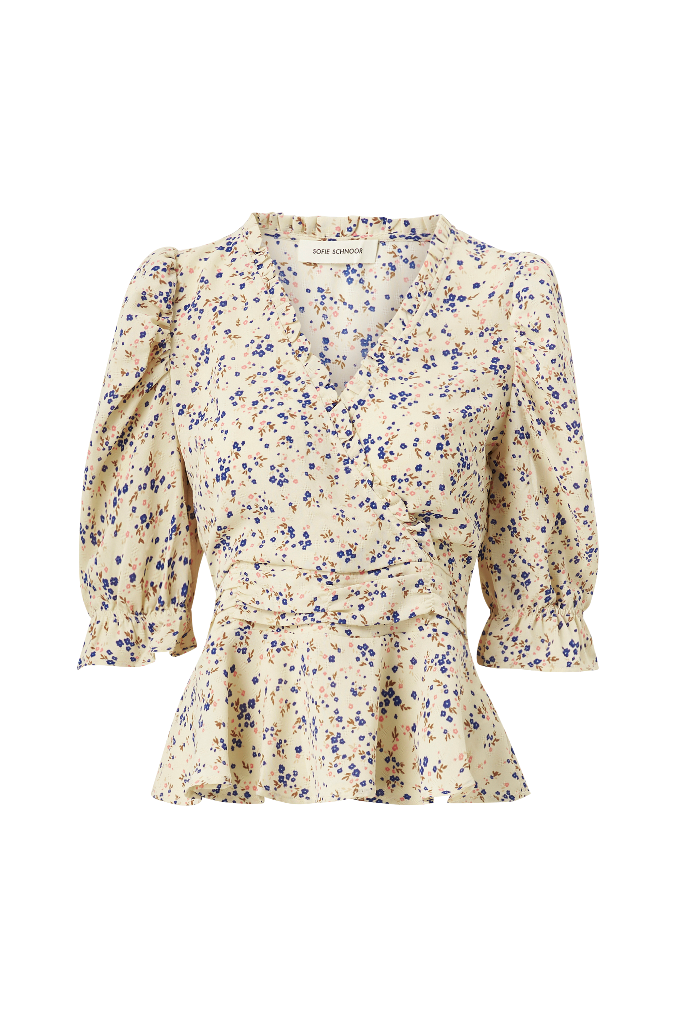 • Peplumdesign med veck i midjan • Omlottdesign med volang • Halvlånga puffärmar med volang i ärmsluten • Dold dragkedja i ena sidan • Produkten innehåller återvunnet material som har tagits tillvara för att minska mängden avfall, samtidigt som nya resurser inte har förbrukats.