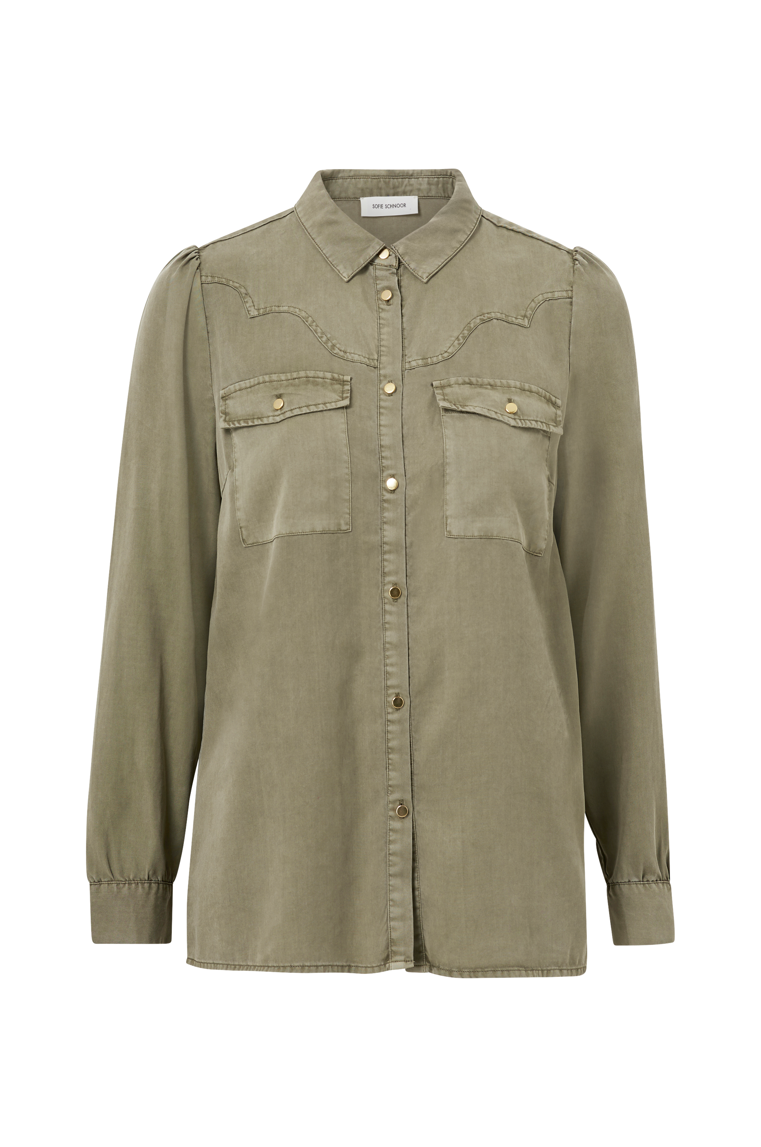 Västerninspirerad modell med vågskuret axelok och guldfärgade knappar fram. Två bröstfickor med lock puffärm med rynk vid axeln och manschett i ärmslut.