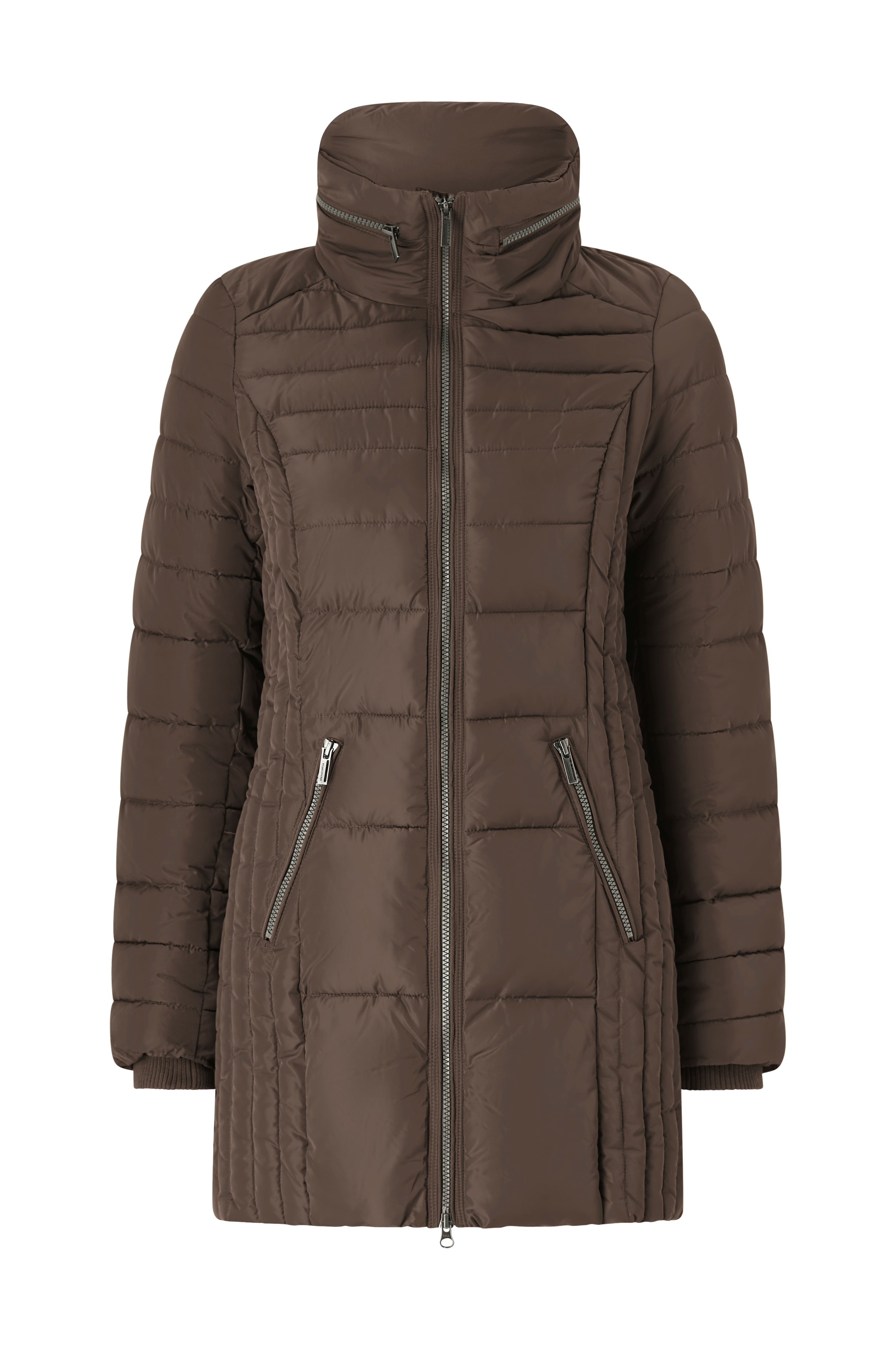 • Quiltad, vadderad jacka• Hög krage med dragkedja och dold huva• Ribbmuddar i ärmsluten• Tvåvägsdragkedja• Två framfickor med dragkedja och invändigt fleecefoder• Lätt utsvängd modell• Textilfoder• Längd: 82 cm i storlek S