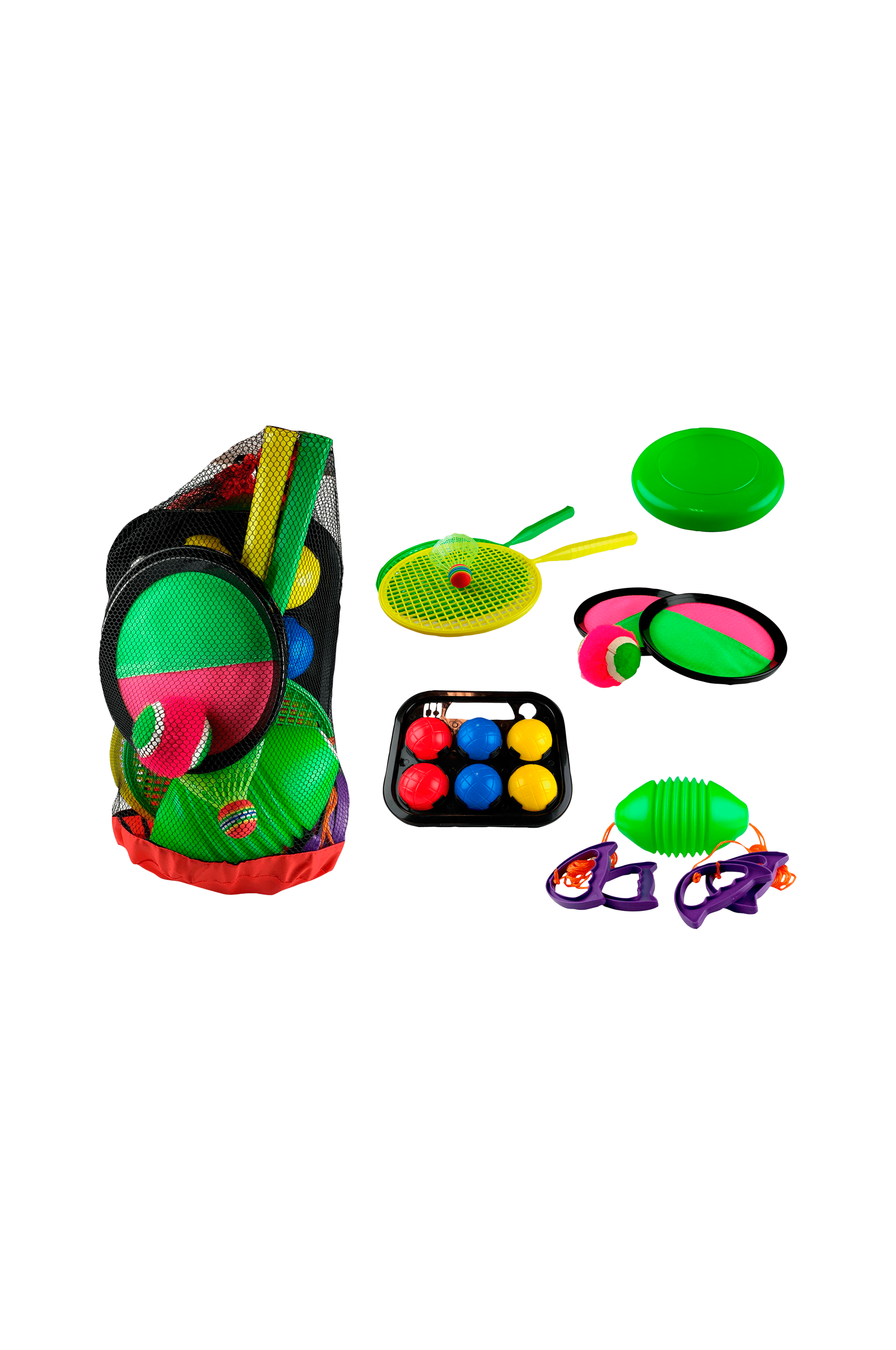 Ryggsäck som är full med roliga spel för hela familjen!Hela 5 olika spel ingår – Badminton, Catch Ball, Boccia, Frisbee och Speedball.