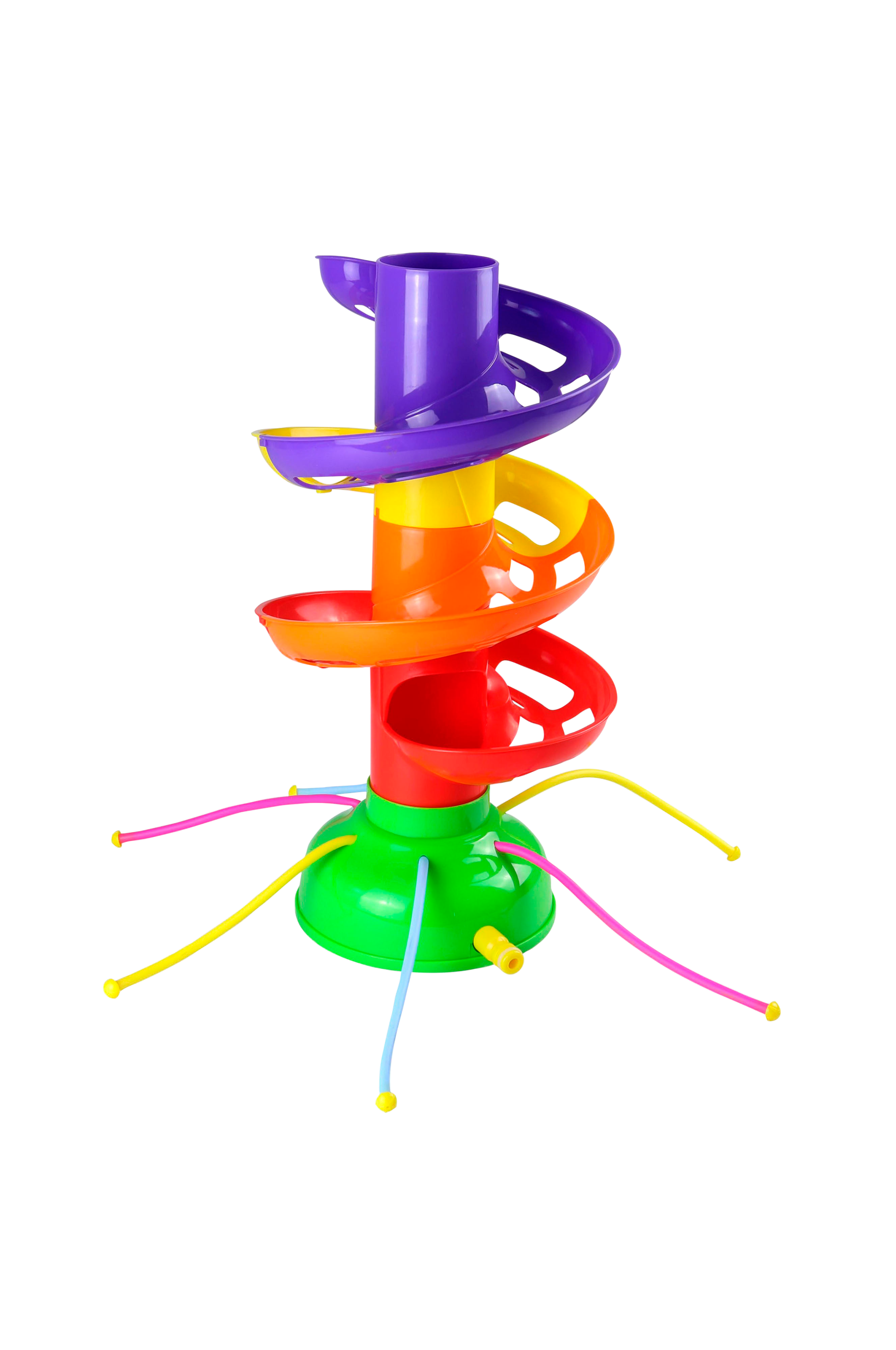 Mata spiraltornet med bollarna och se hur vattnet skjuter upp bollarna i luften.
