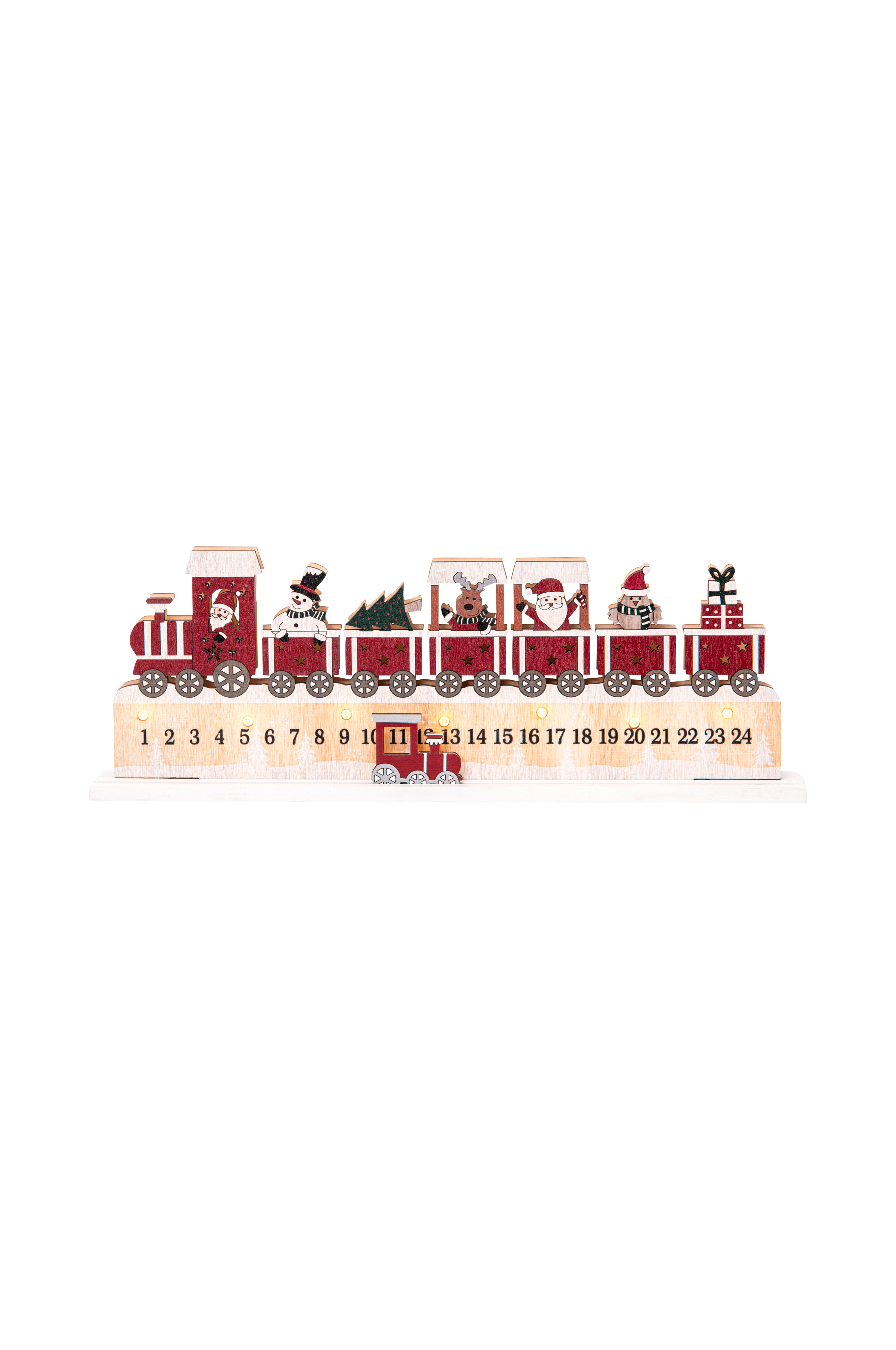 Julkalender i form av ett tåg med vagnar och glada passagerare. Räkna ner dagarna till julafton genom att skjuta på det lilla lokomotivet. Fina julfärger, en klassiker att ta fram från år till år. Små led-punkter som lyser fint och skapar en mysig atmosfär