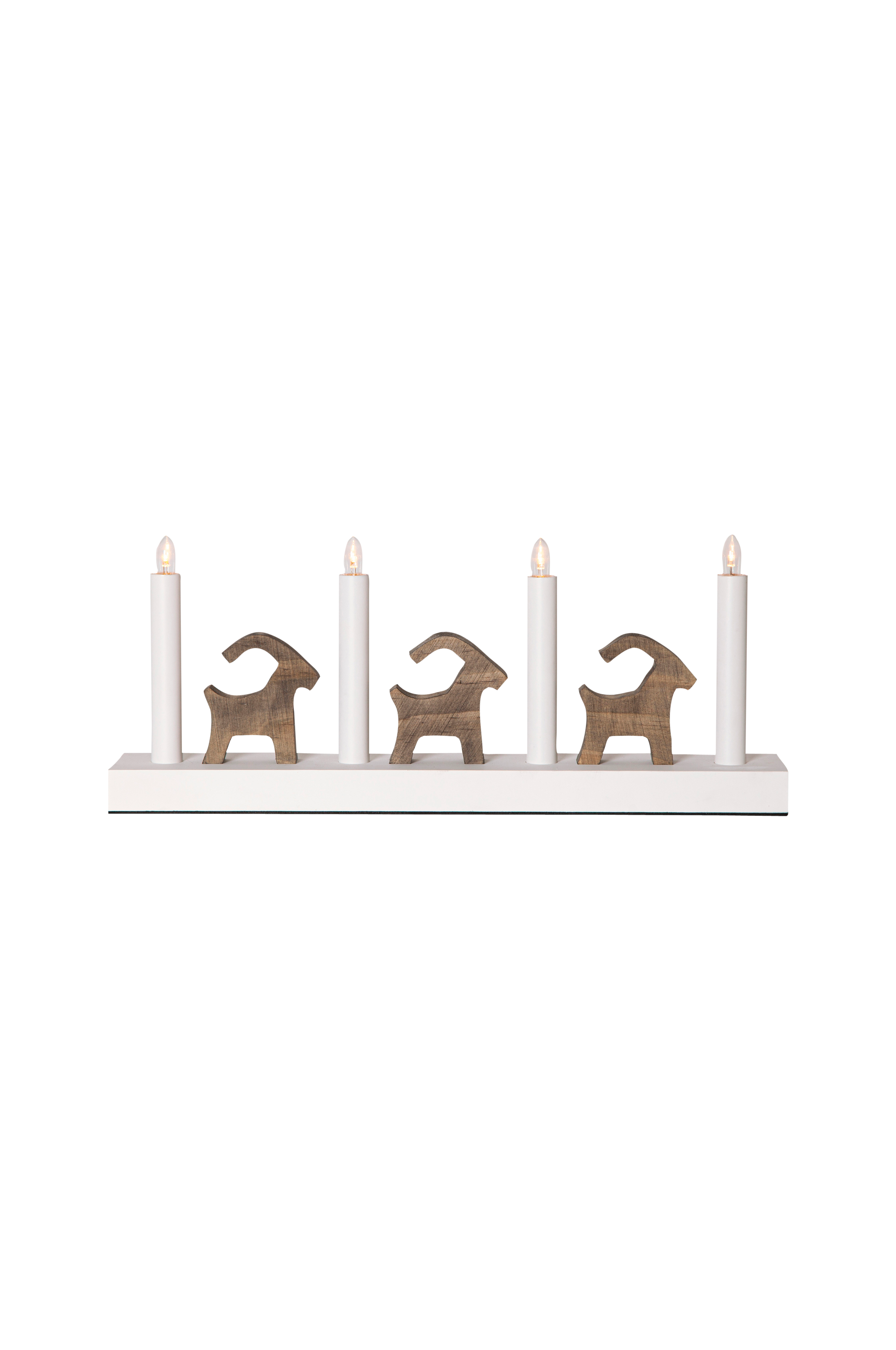 Klassisk ljusstake som ger ett modernt intryck. Julbockar och en träbotten tillsammans med metallrör. Lyser fint med fyra led-lampor. Skapar en fin julkänsla och en härlig atmosfär. En självklar ljusstake i hemmet från år till år. Förhöj ljusstaken genom att använda vår ljushållare för led-ljus i samma serie.