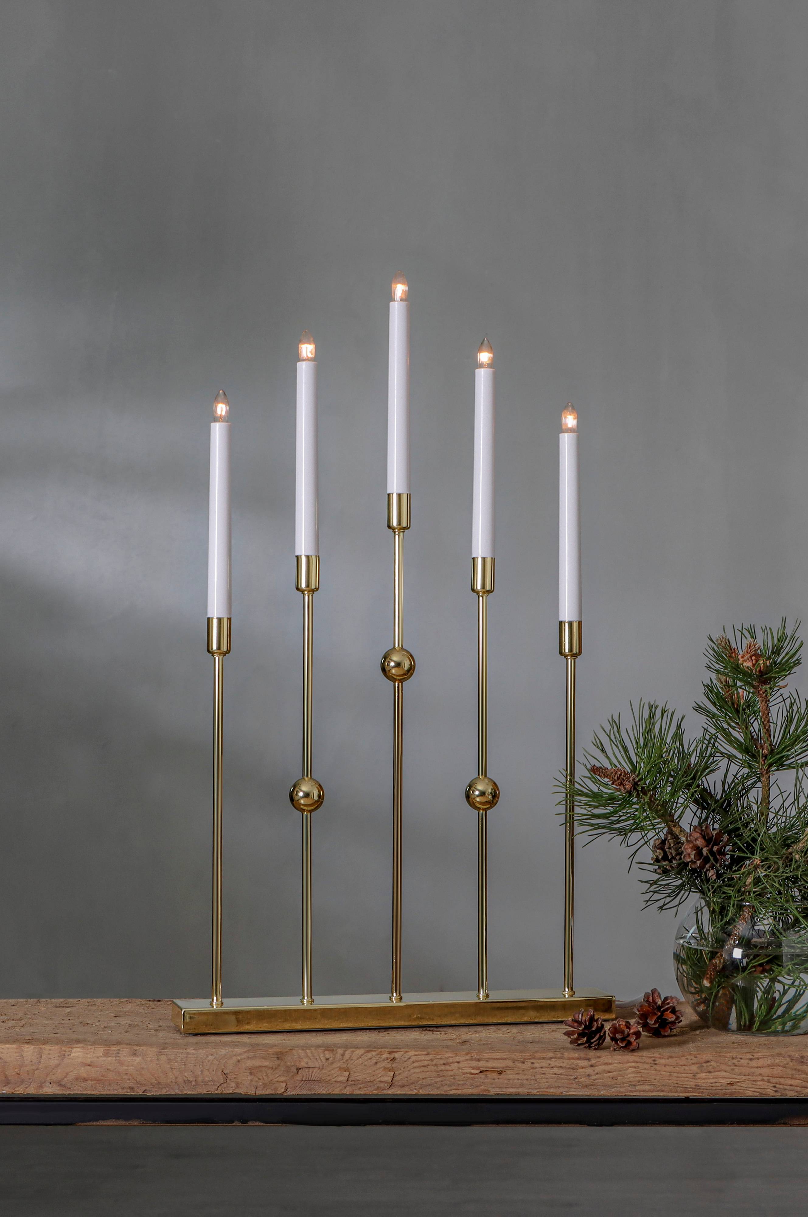 Stilren adventsljusstake i metall. Färgen är mässings. Ljusstaken har 5 ljuskällor med mysigt sken. Placera i ett fönster eller på en skänk, passar utmärkt till advent och jul.