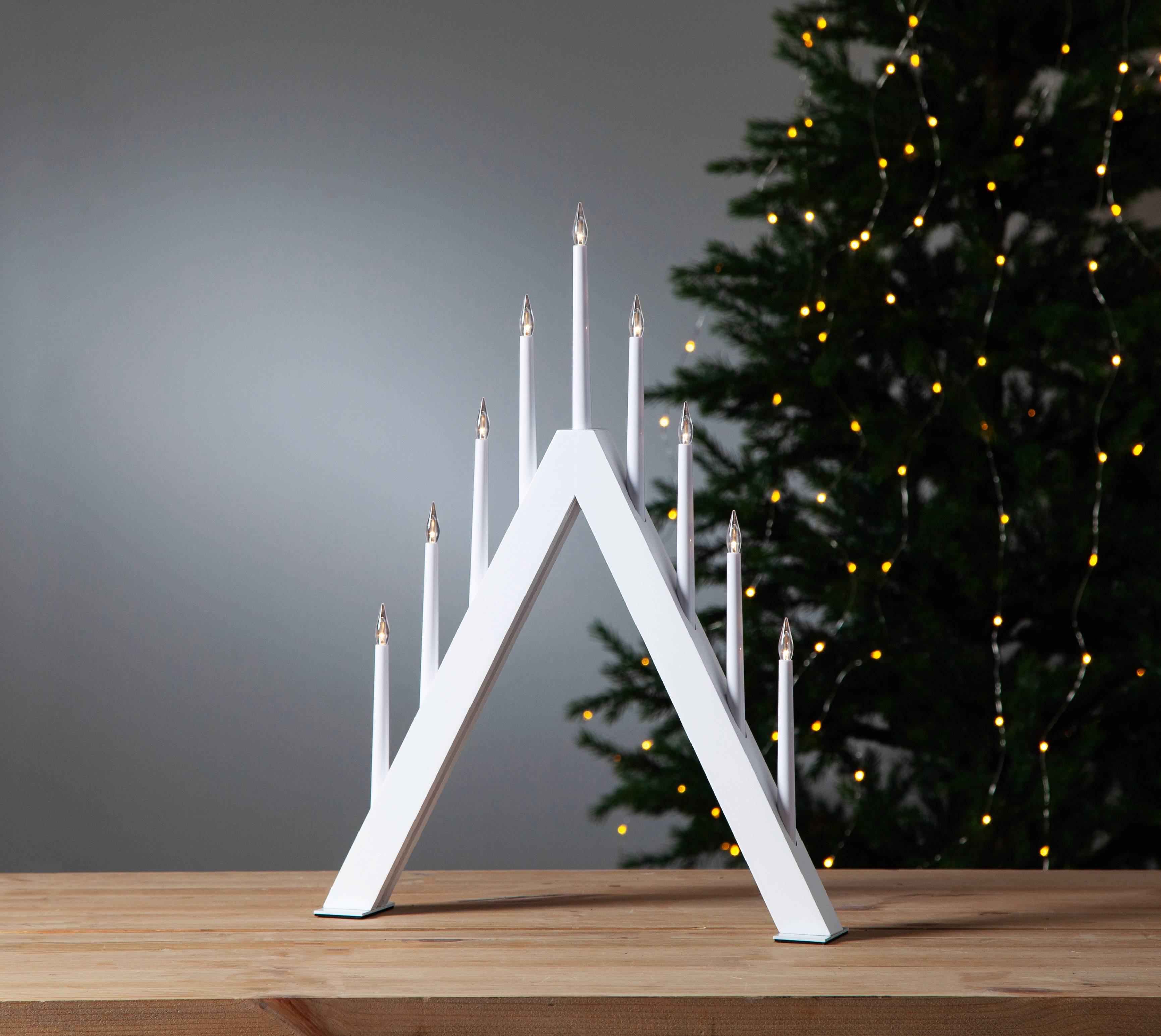En nätt dekorativ ljusstake i trä med smala ljuspipor för inomhus bruk. Höjd 48 cm, bredd 38 cm. Antal lampor 9 (ej utbytbara) Sprider fint ljus och skapar en härlig stämning. Transparent anslutningskabel med strömbrytare, längd 180 cm.
