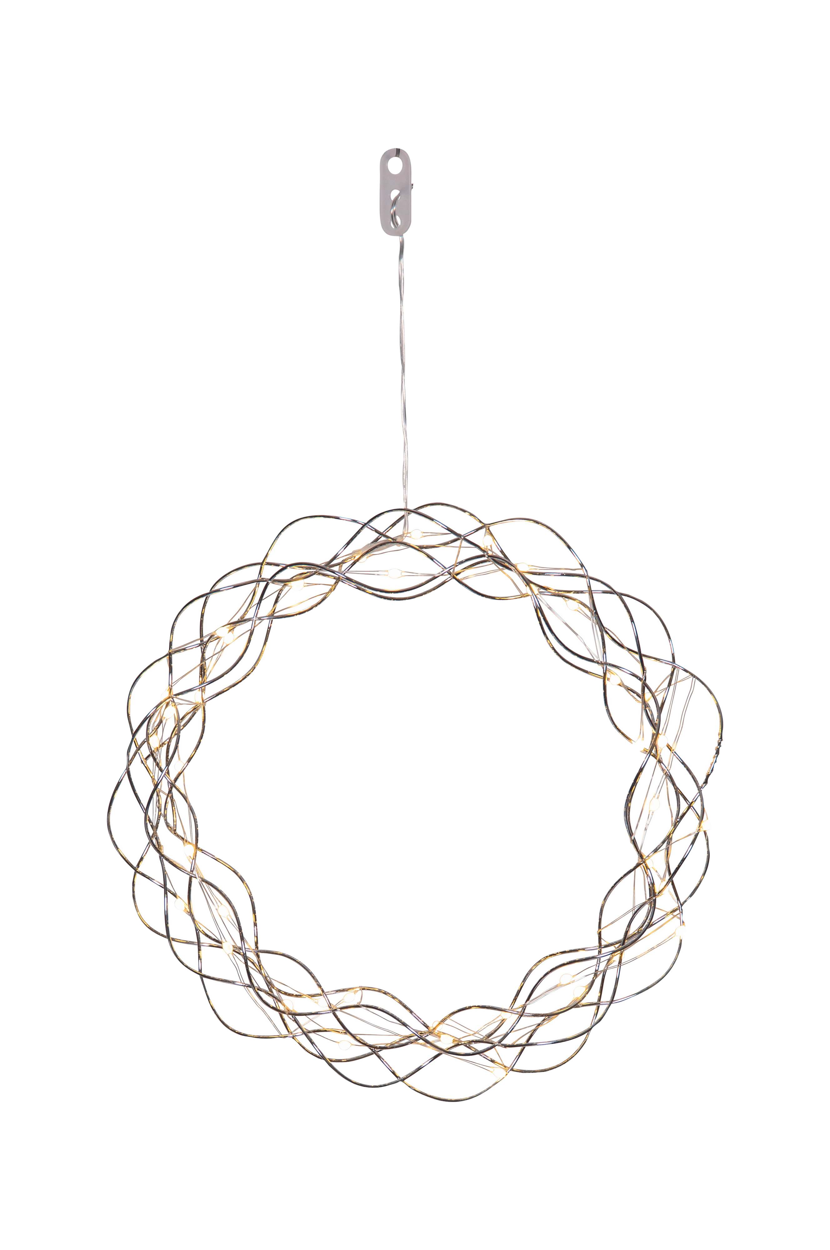 Dekorativ kromfärgad krans med ljusslinga med daggdroppar för inomhusbruk. Kransen har 40 led-ljuspunkter med varmvitt sken. Dimmer i tre steg och timer. Fin dekoration att hänga i fönstret.