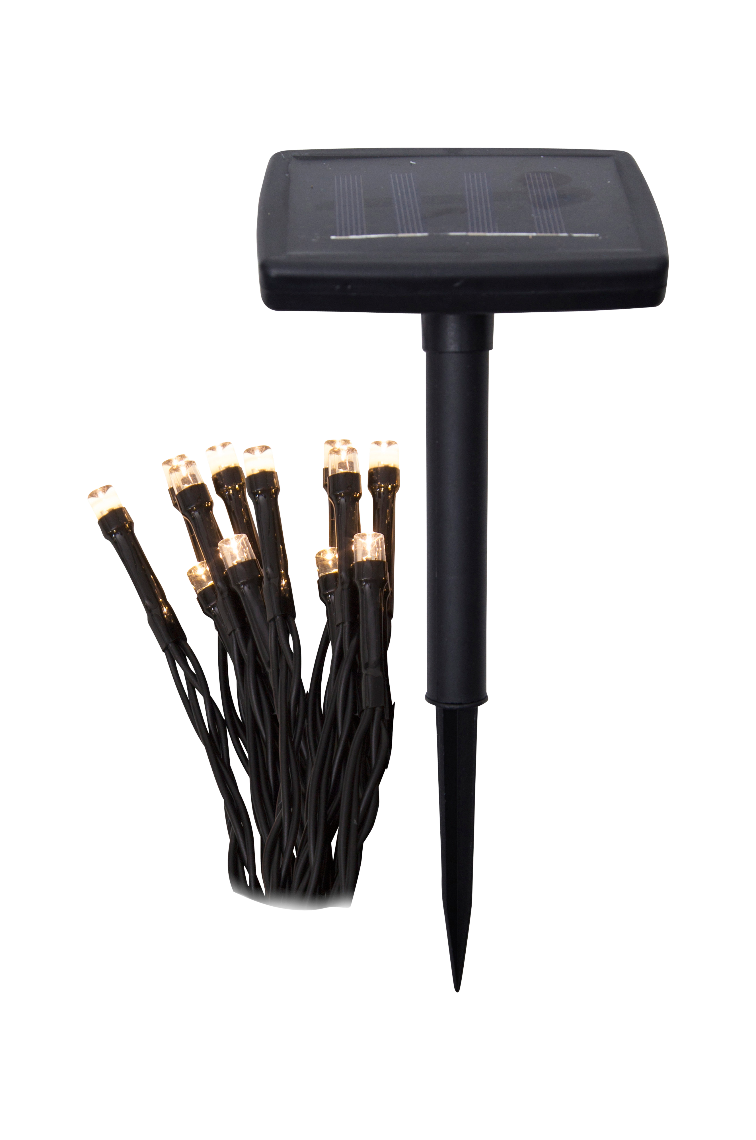 Solcellsslinga med 100 varmvita LED ljuspunkter för utomhusbruk. Slingans längd är 10 meter och anslutningskablens längd är 3 meter. 1 batteri AAArechargeableNiMH ingår. IP44. Brinntid ca 10000 timmar.