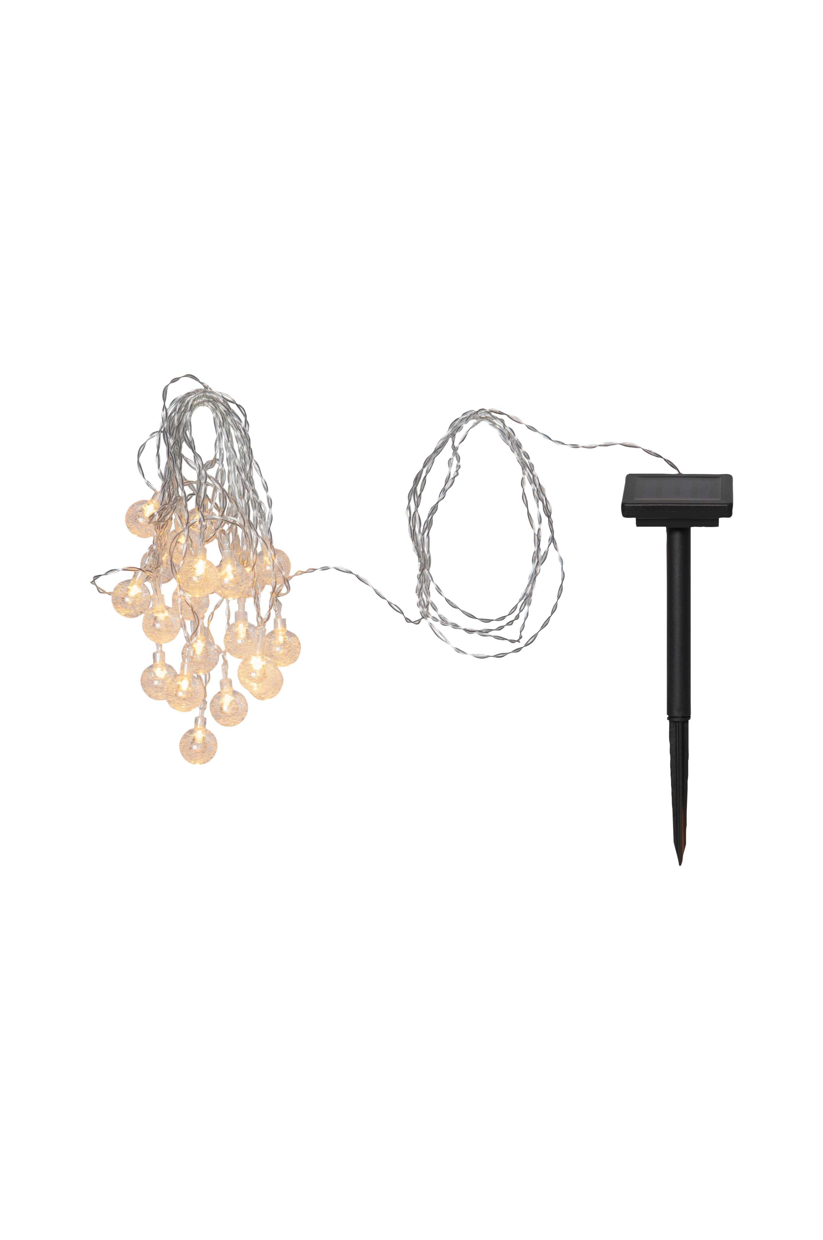 Solcellsdriven ljusslinga med små genomskinliga kulor med luftbubblor inuti. Separat panel gör det enkelt att placera ljusslingan i skuggan och panelen i solen. Kabellängd 200 cm.