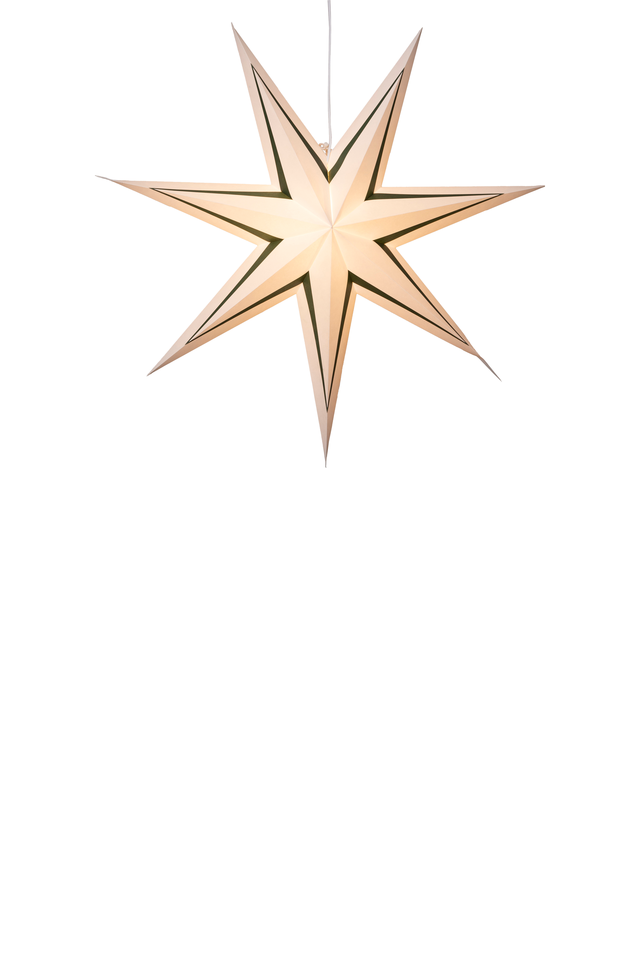 Randig stjärna av papper. Klassisk vit stjärna med ränder. Dekorera inför advent och det kommer att ge en härlig julstämning. Köp till ett sladdställ och ljuskälla för att lysa upp stjärnan.