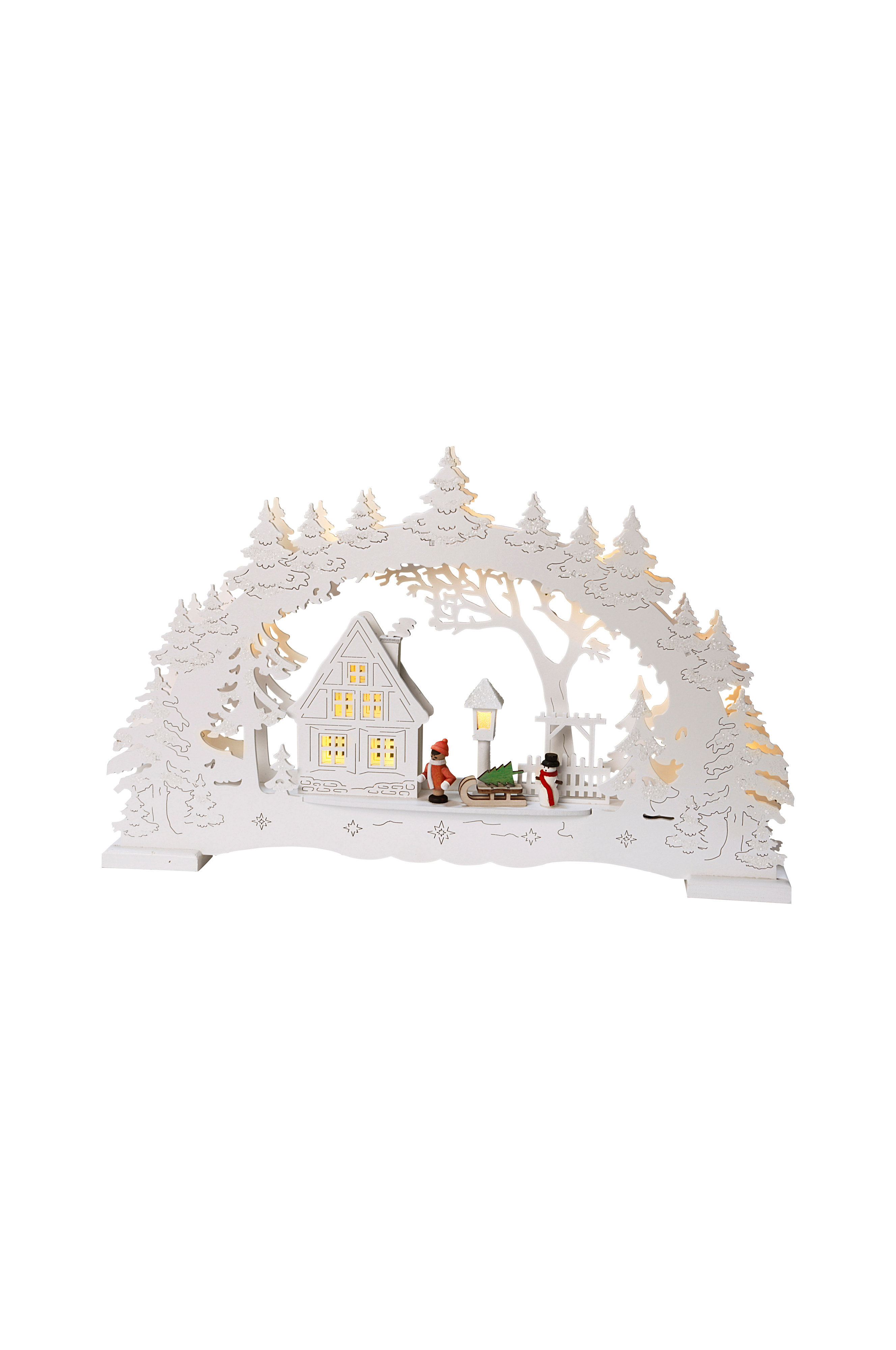 Mått: Bredd 43 cm. Djup 5,3 cm. Höjd 27 cm. Lazercut träljusstake i vitt med bymotiv. 10 LED-dioder i varmvitt sken. Fungerar med batterier eller med transformator. 3 AA batterier, ingår inte. Transformatorns sladd 5 m.