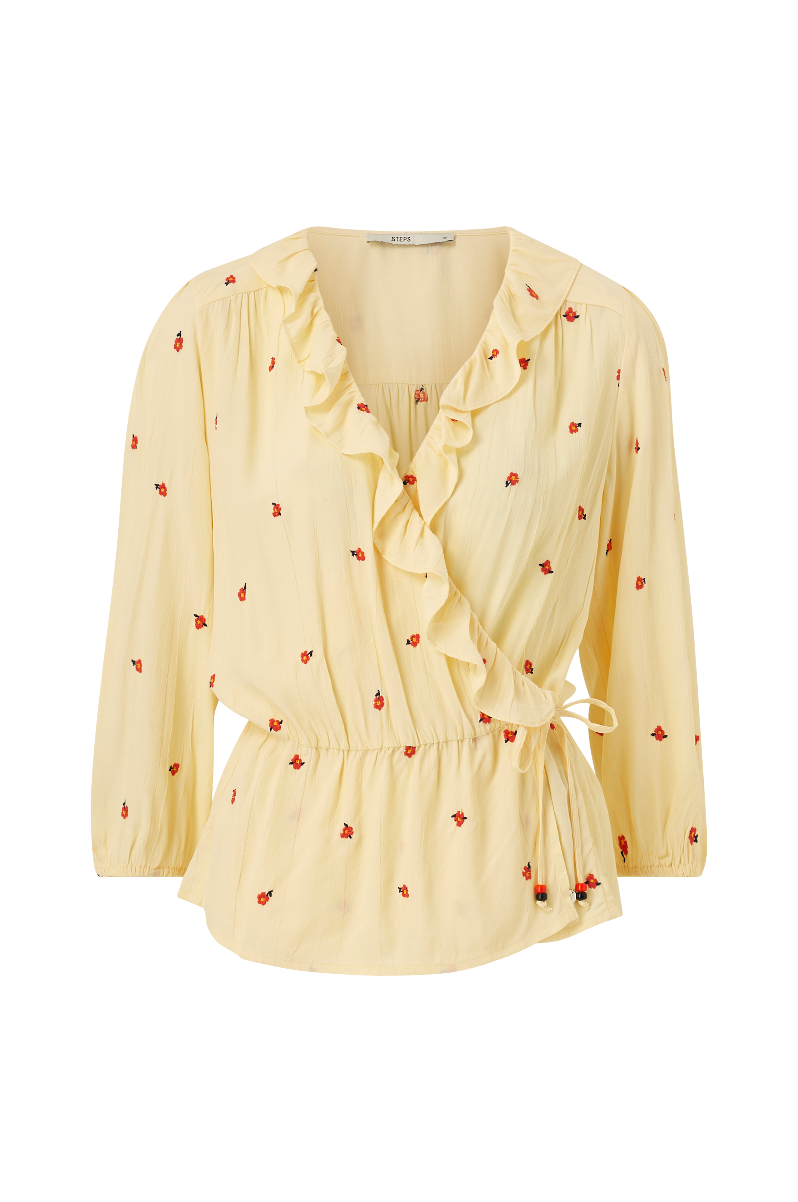 Omlottblus Genni Blouse från Steps. Öppen omlottmodell med invändigt och utvändigt knyt i sidan samt avskärning runt om i midjan. Påsydd volang i hals och framkant vid, 3/4-lång ärm med infälld resår i ärmslut.