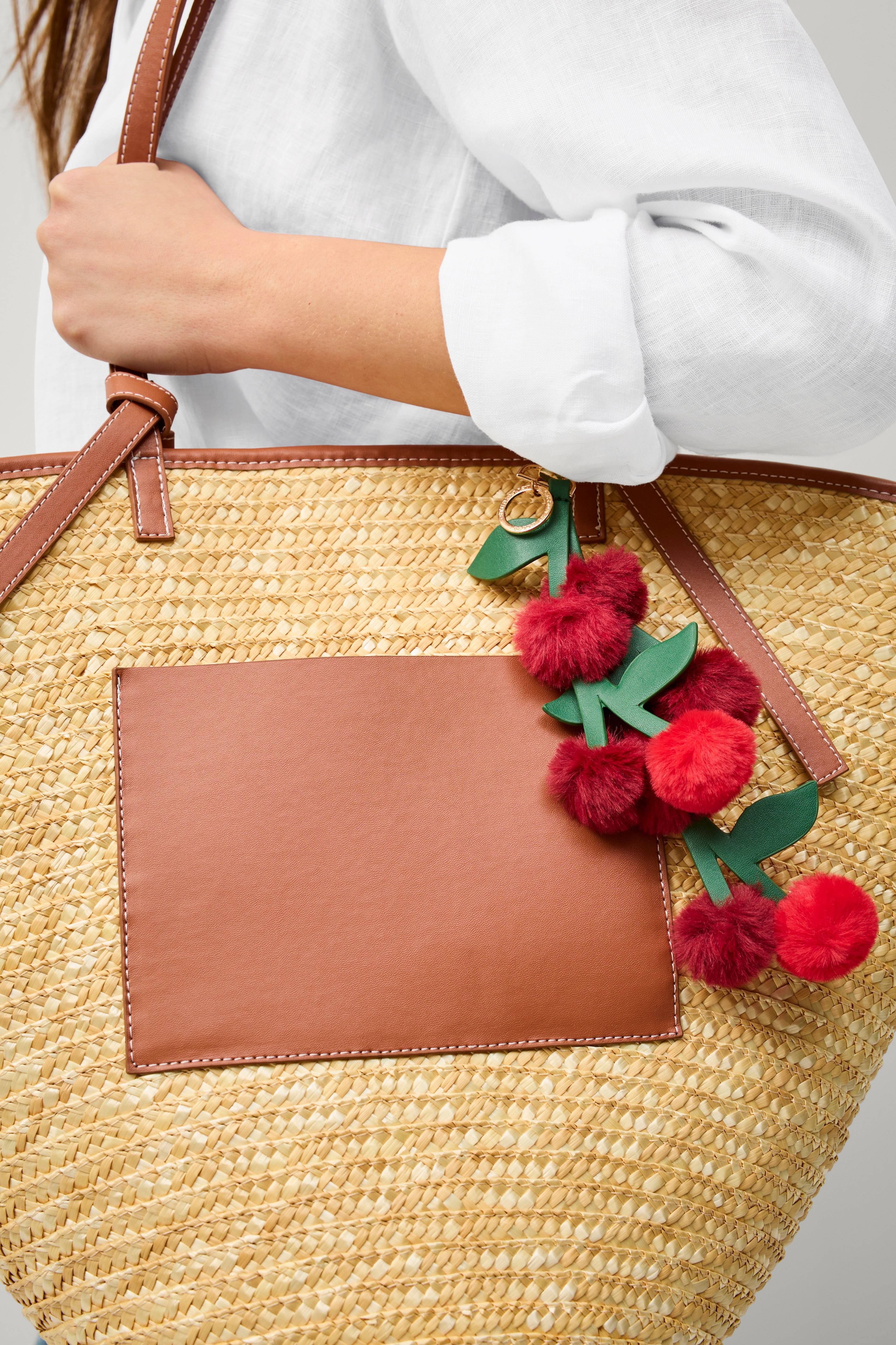 Väskdekorationen från Studio Lisa Bengtsson by Ellos består av 8 körsbär i mjuk, fluffig fuskpäls med gröna blad i skinnimitation. Karbinhake och graverad ring i guldfärgad metall. Längd inkl. hake ca 25 cm.
