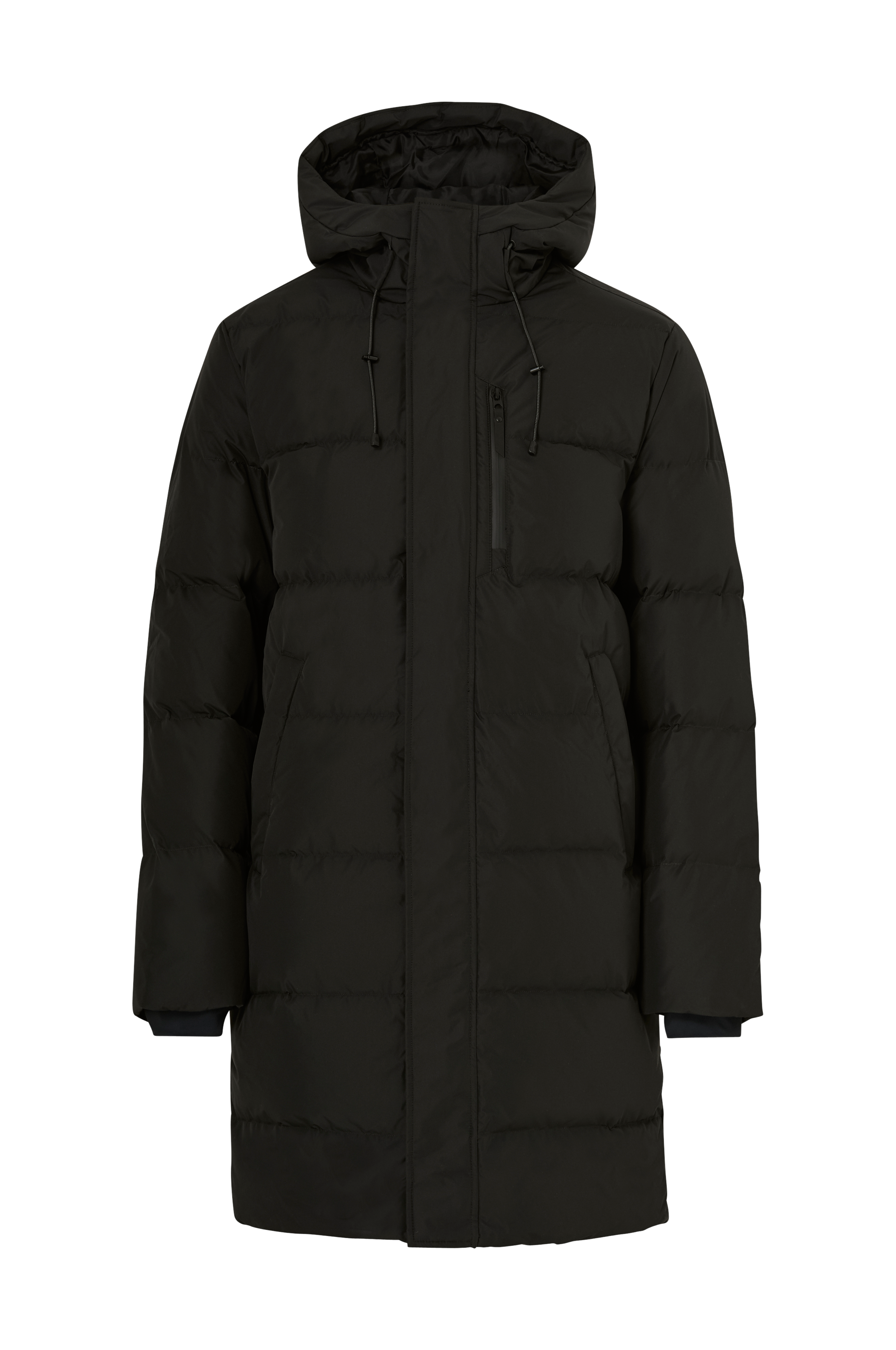 • Lång, quiltad modell• Knappslå med dold tvåvägsdragkedja• Hög krage• Huva med dragsko• Fickor med en dragkedja• Invändig mudd i ärmsluten• Längd: 100 cm i storlek M