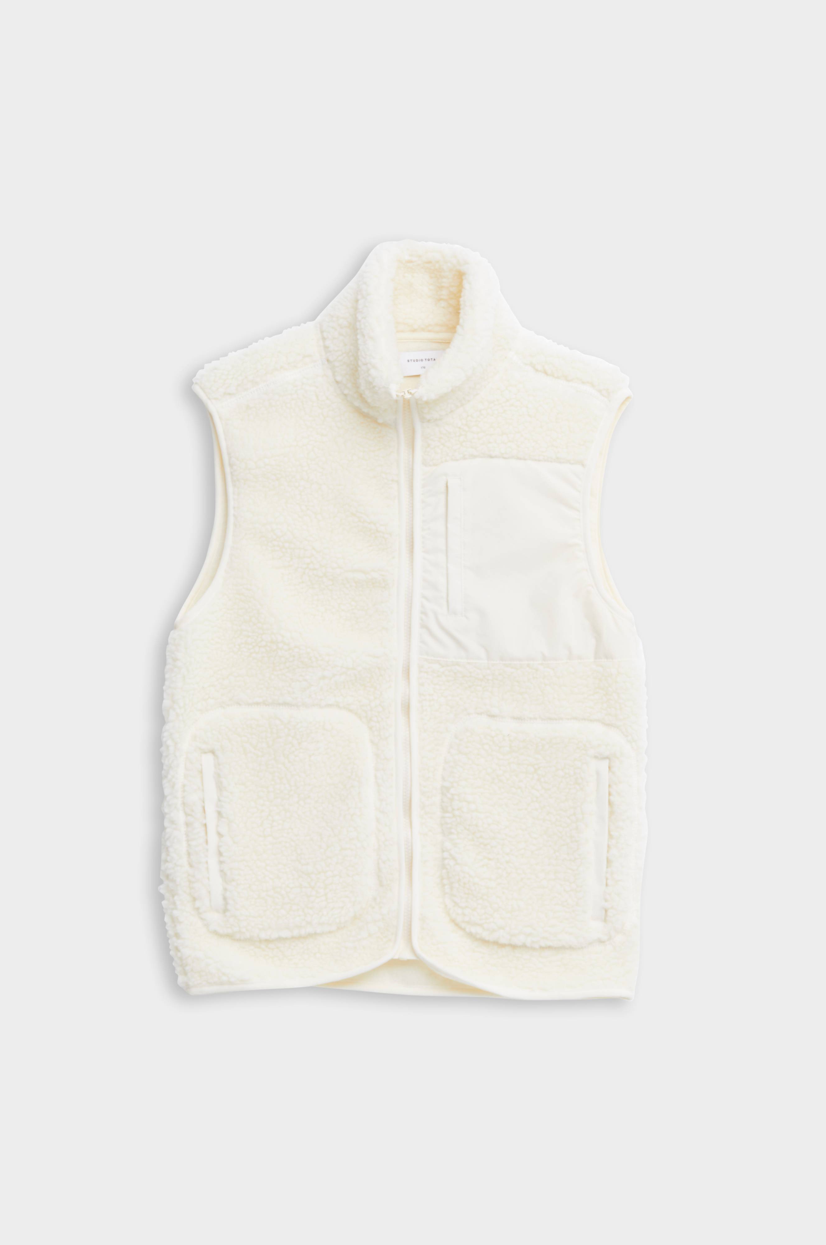 Väst Pile Vest från Studio Total. Väst i återvunnet teddymaterial med nylonficka på bröstet. Den har även två sidofickor som stängs med dragkedja.