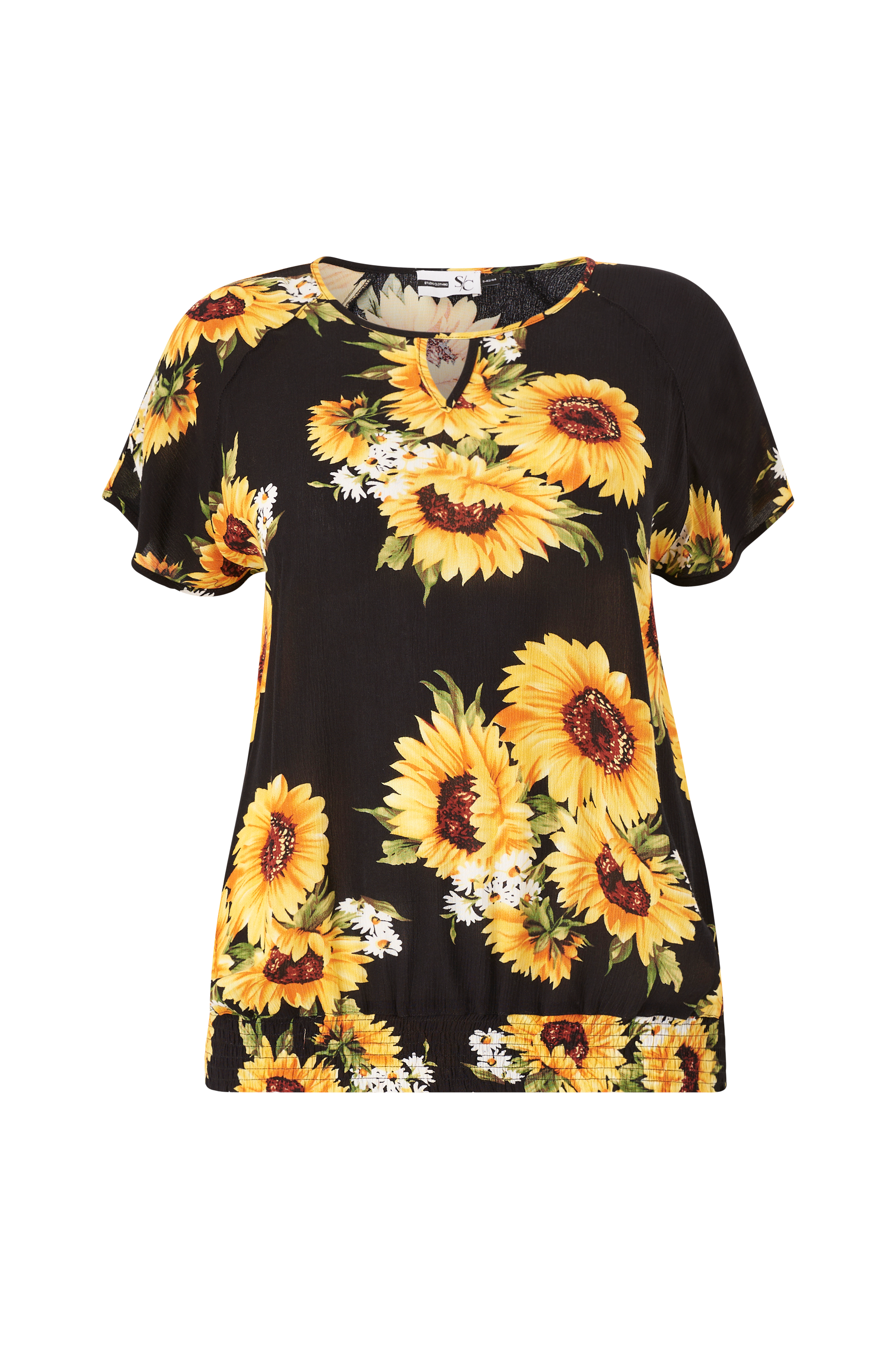 • Blus i viskos• Rund halsringning med sprund fram• Kort ärm• Smock i nederkanten• Plusstorlekar