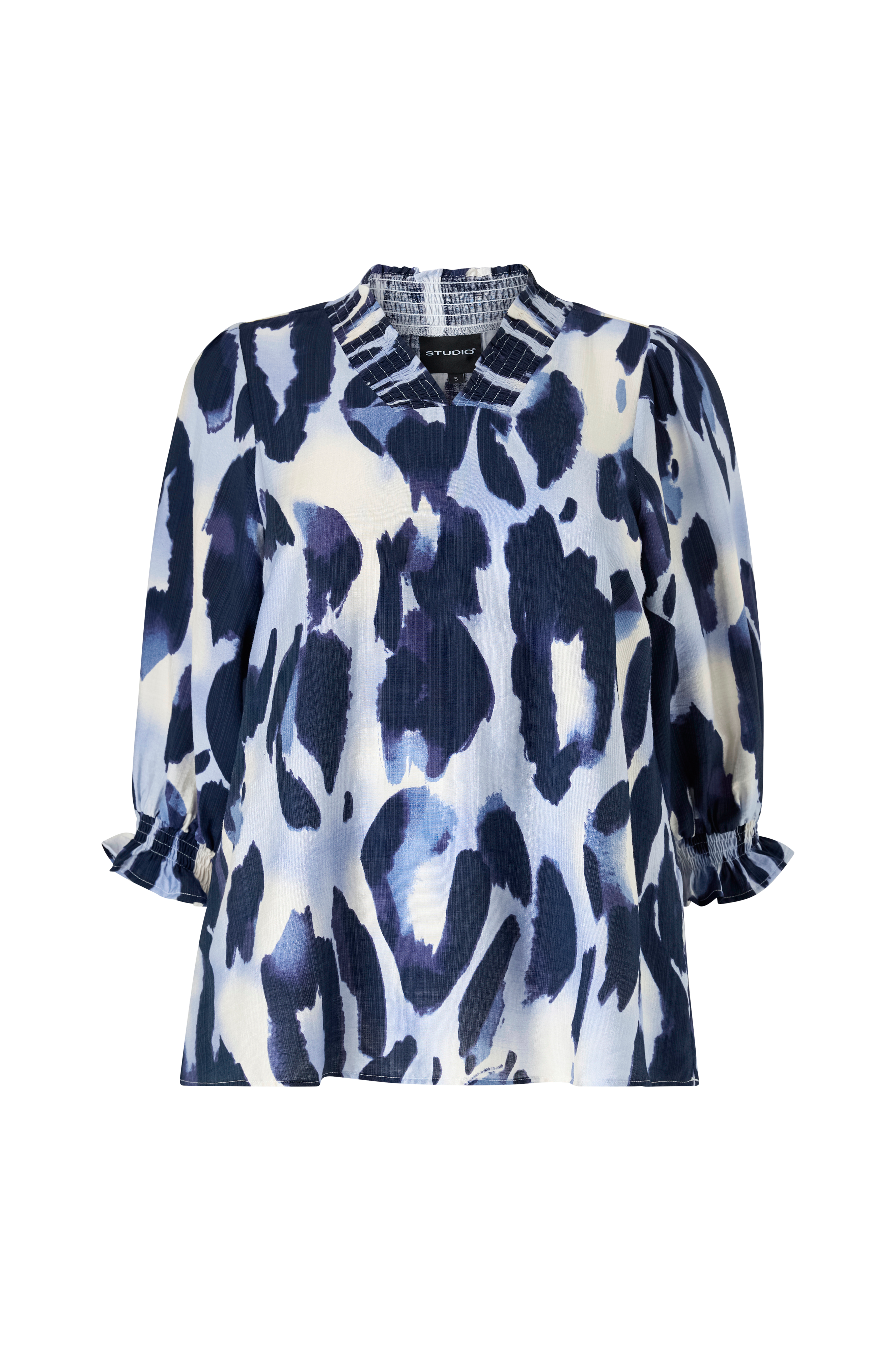• Blus i viskosmix• V-ringad hals med smock• Halvlånga puffärmar med smock i ärmsluten• Plusstorlekar