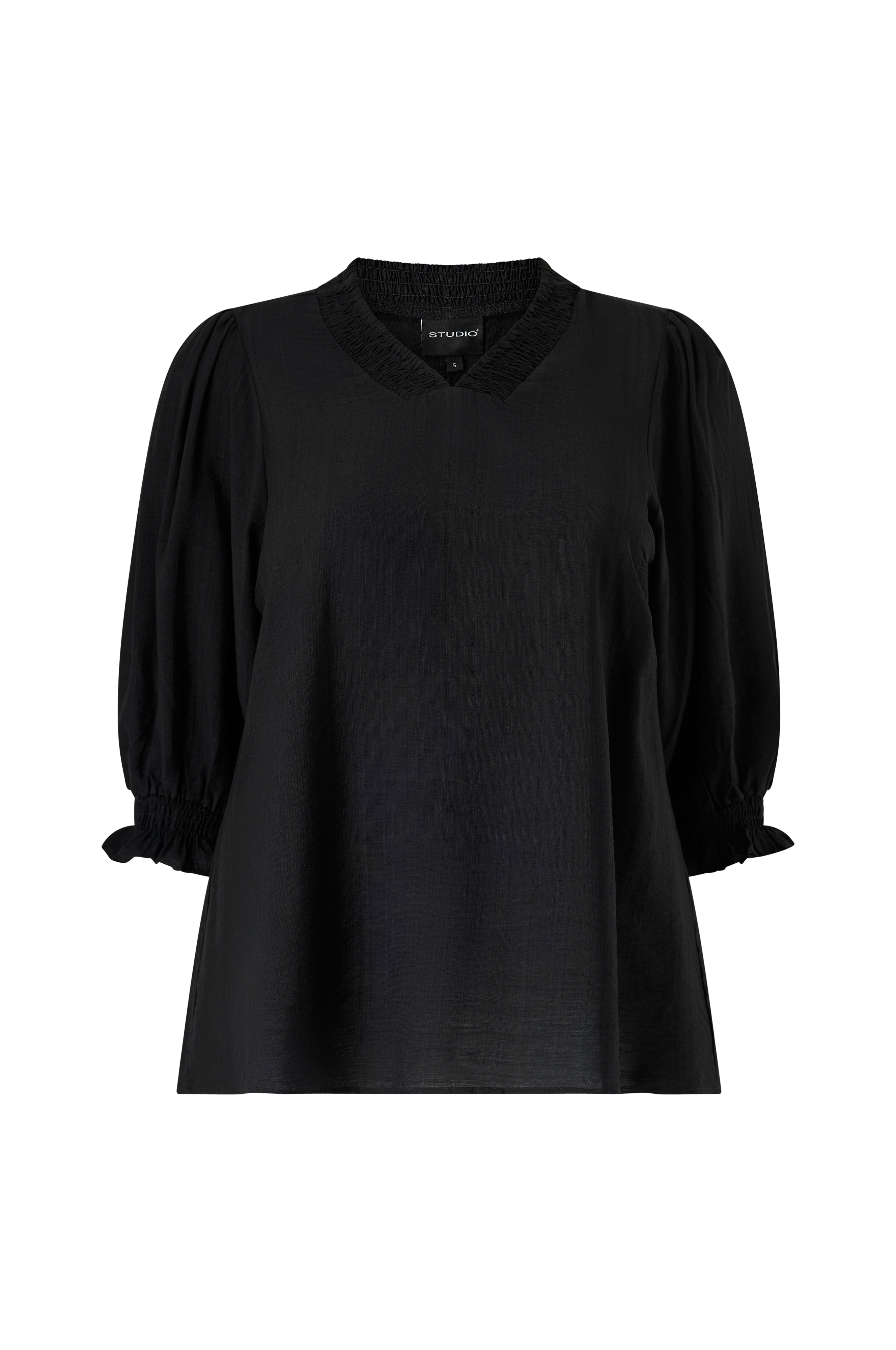 • Blus i viskosmix• V-ringad hals med smock• Halvlånga puffärmar med smock i ärmsluten• Plusstorlekar