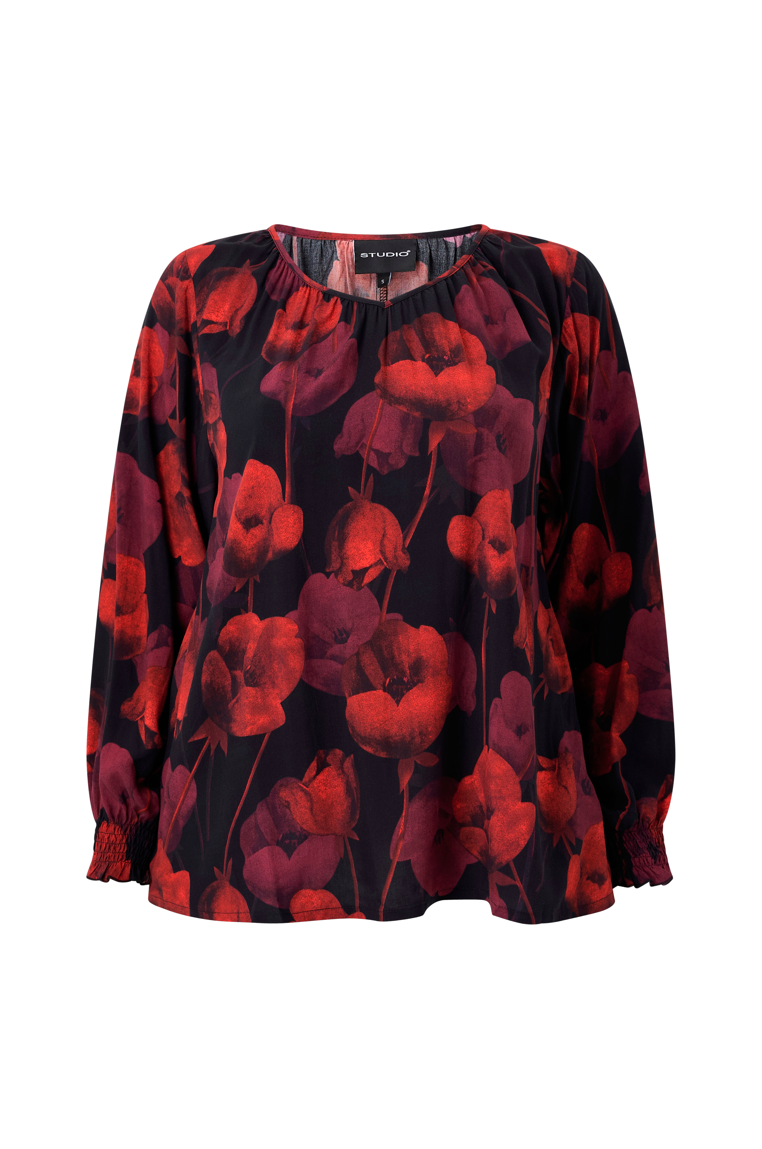 • Mönstrad blus i viskos• V-ringning• Långa ärmar• Smockade ärmslut• Plusstorlekar