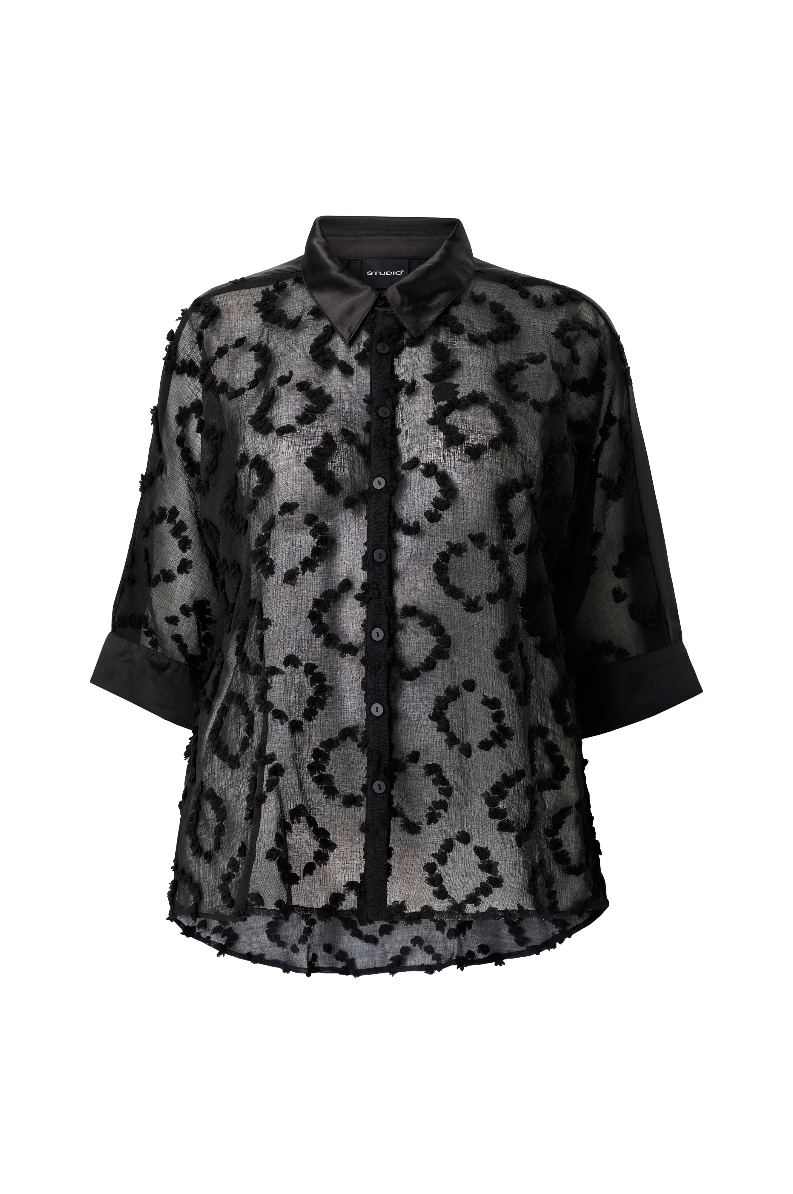 • Transparent blus med dekorativa applikationer och partier i satin• Krage• Halvlånga ärmar• Knappstängning• Plusstorlekar