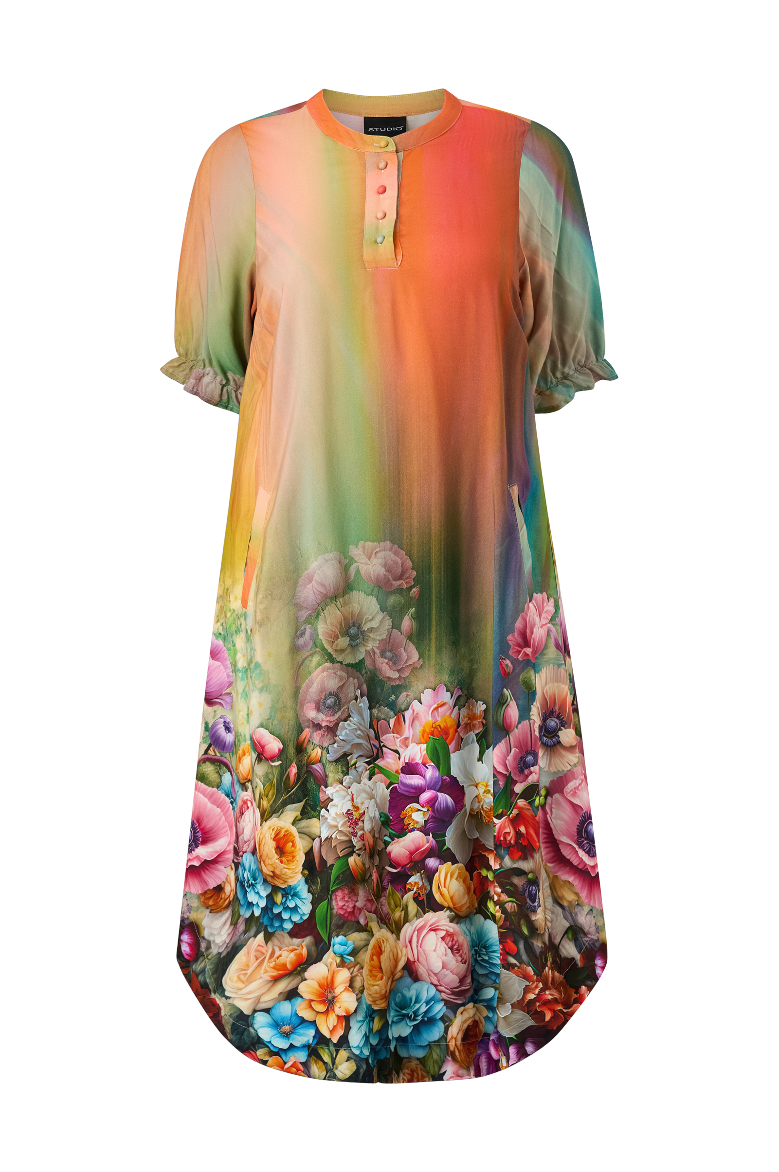 • Färgstark klänning med blommigt mönster• Klädda knappar upptill fram• Halvlånga ärmar med volangkant• Fickor• Rundad nederkant• Längd: 128 cm i storlek S• Plusstorlekar
