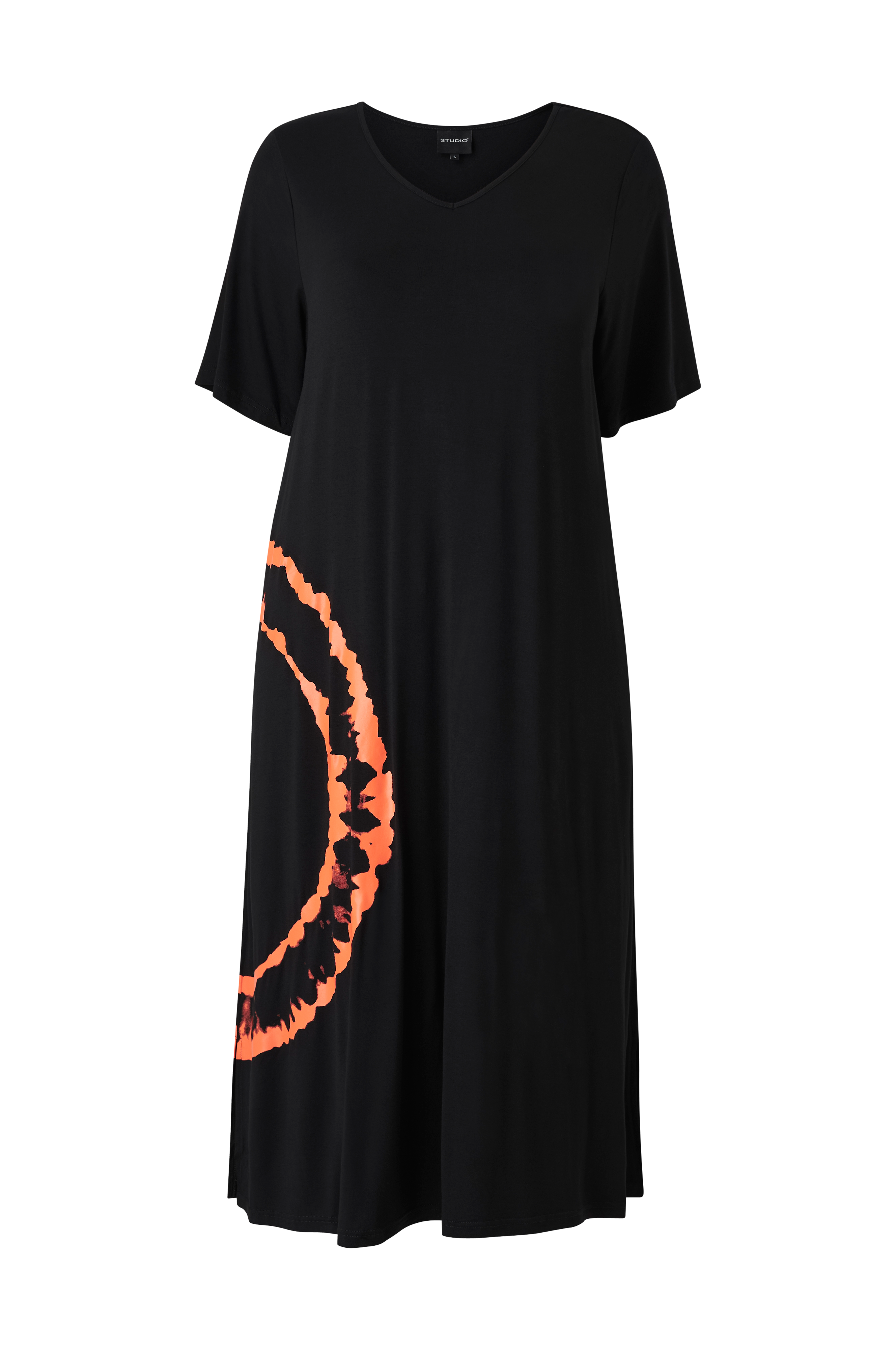 • Klänning i mjuk, stretchig viskostrikå• V-ringad hals• Kort ärm• Tryck på ena sidan• Slitsar i sidorna• Plusstorlekar• Längd: 130 cm i storlek S