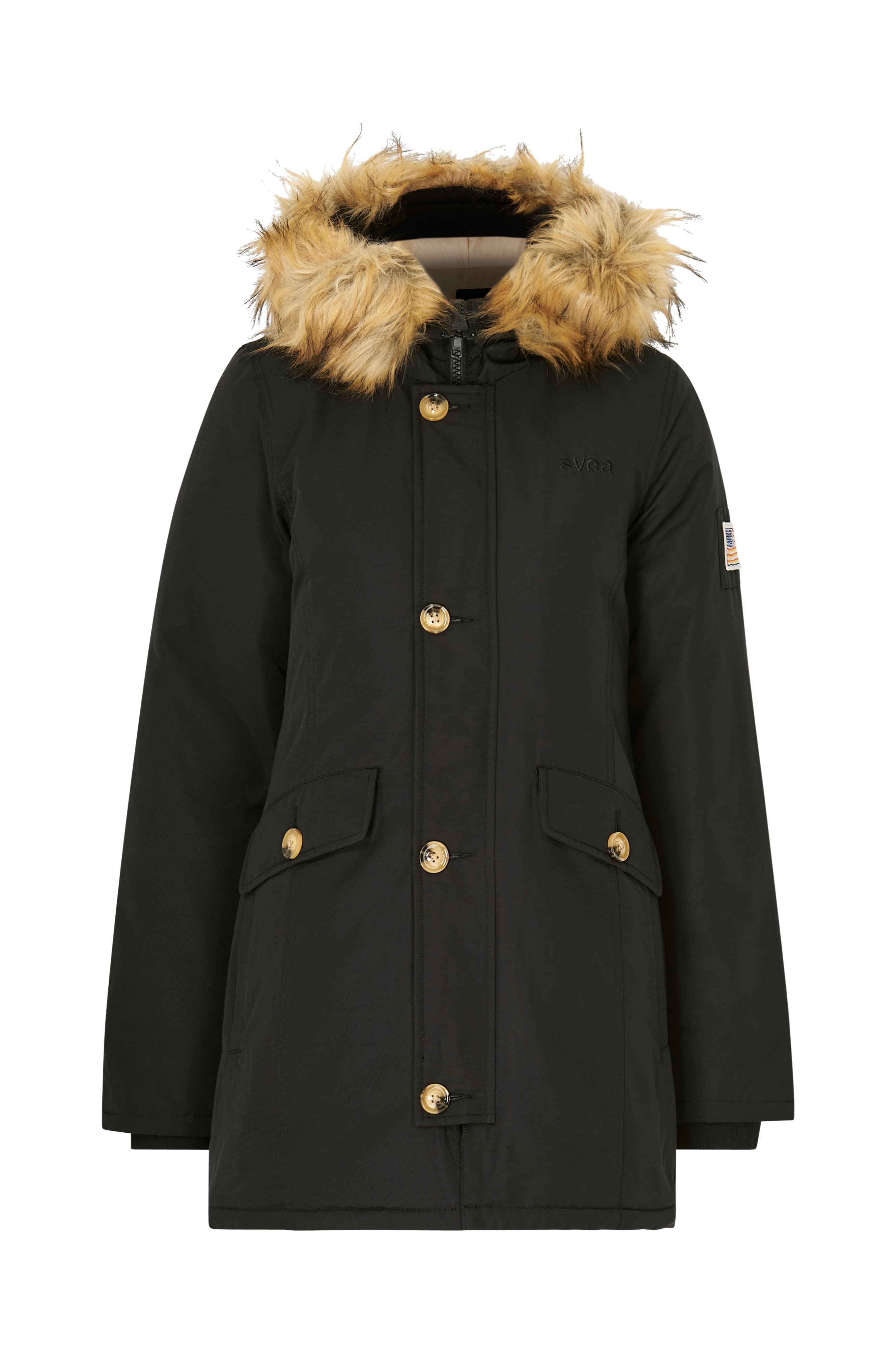 • Varm dunjacka med smal, lätt utsvängd passform • Fast, justerbar huva med avtagbar fuskpälskant • Tvåvägsdragkedja • Vindslå med knappar över dragkedjan • Två sidfickor med fleecefoder • Två fickor med knäppbara lock • En innerficka med kardborrestängning • Ribbmuddar i ärmsluten • Invändig dragsko i midjan • Längd: 84 cm i storlek S