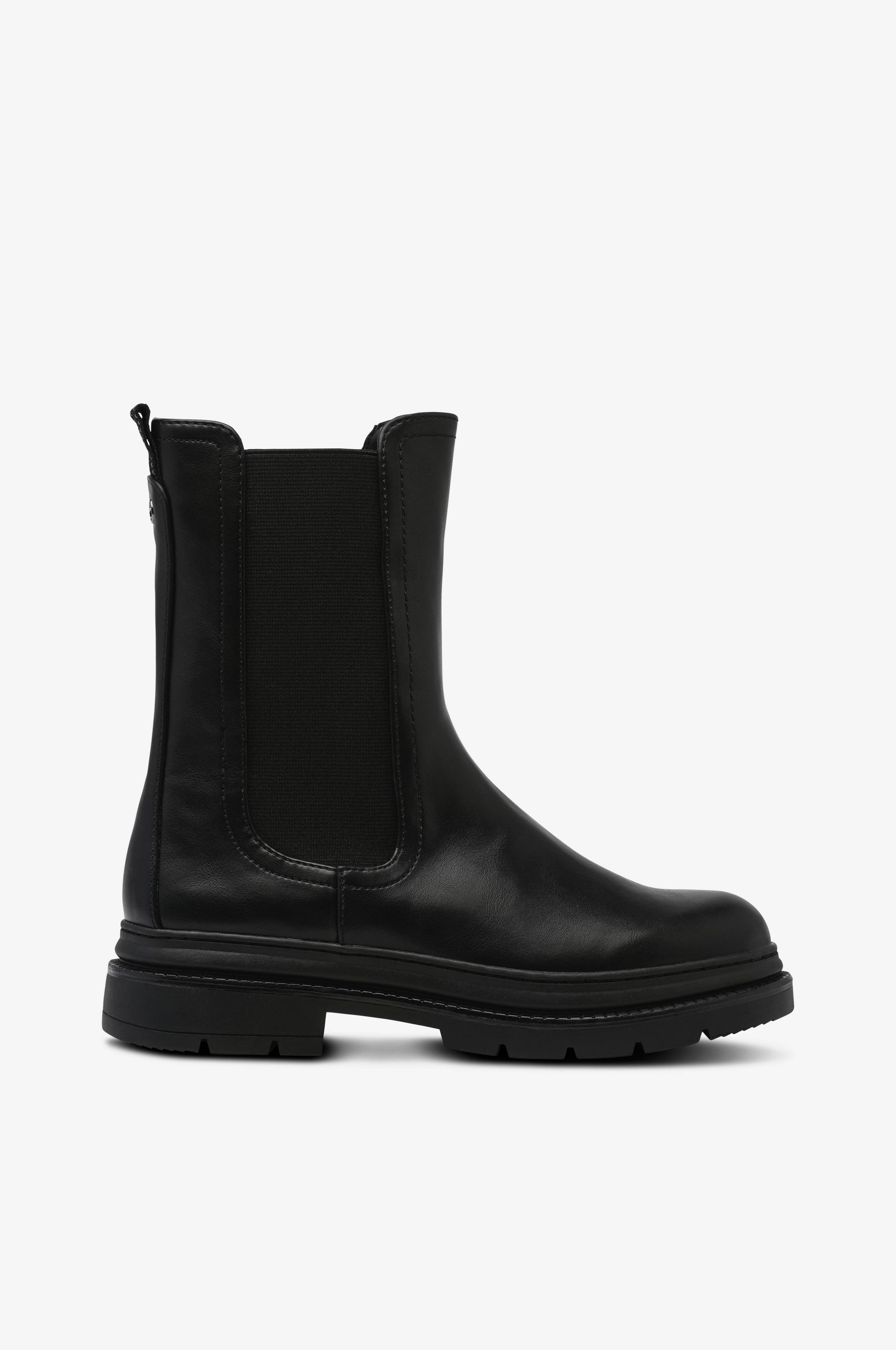 • Modell i skinnimitation • Breda resårpaneler på sidorna • Vävd draghälla bak • Textilfoder • Grovmönstrad yttersula • Skafthöjd: 19,5 cm i stl 37 • Klackhöjd: 4,5 cm